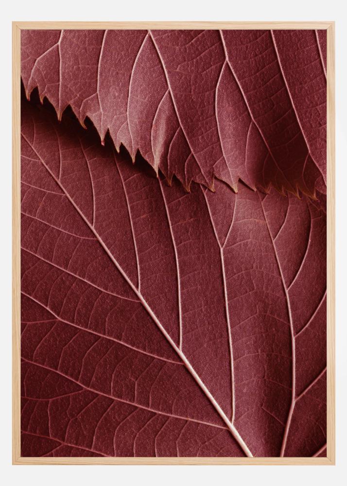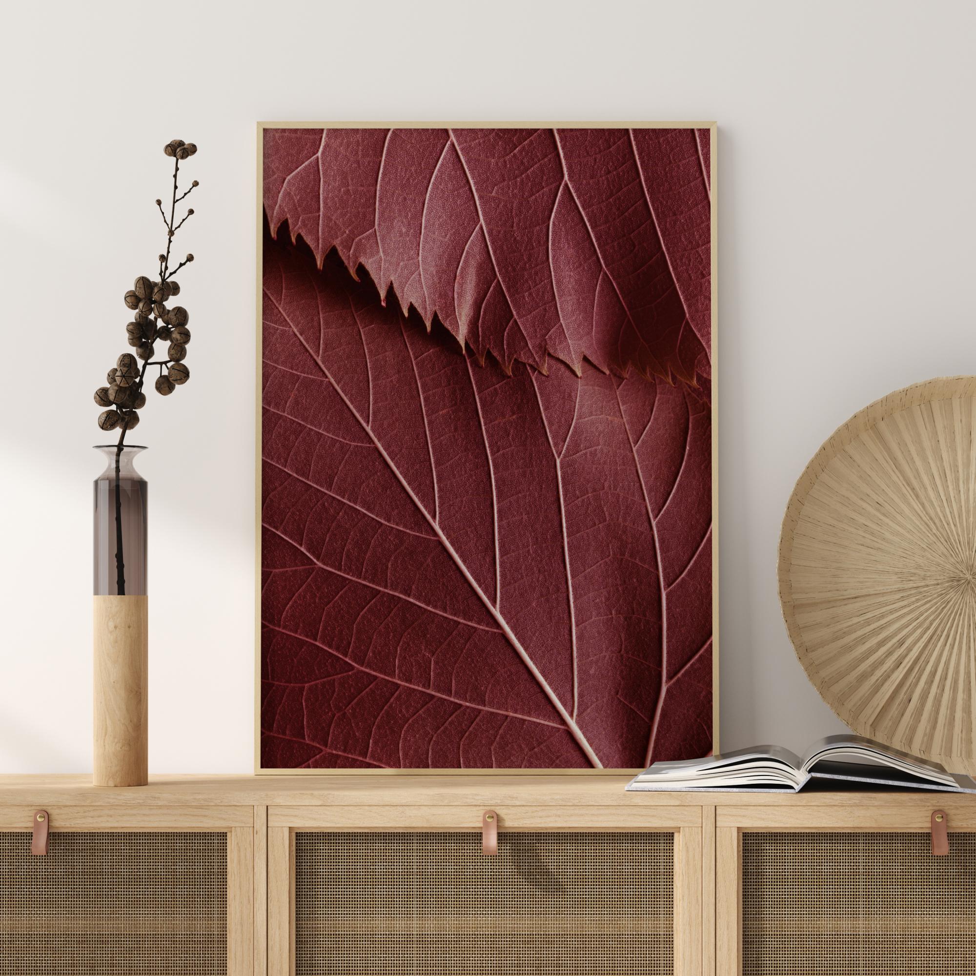 Botaninis nuotraukų menas iš tamsiai raudonų lapų su gyvais raštais. Elegantiškas plakatas šiltuose atspalviuose, stilius, kuris puikiai tinka derinti su kitais nuostabiais motyvais ant didesnės paveikslėlių sienos.