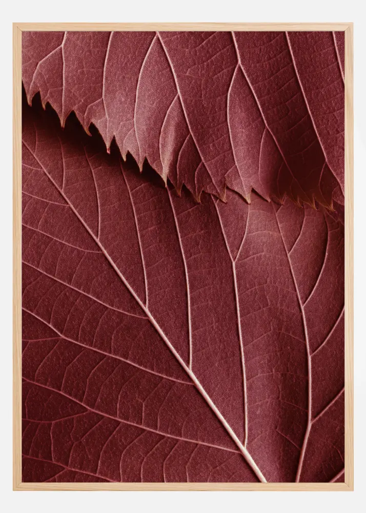 Botaninė fotomeno kūrinys iš tamsiai raudonų lapų su ryškiais raštais. Stilingas plakatas šiltų atspalvių stiliumi, kuris puikiai dera su kitais nuostabiais motyvais ant didesnės sienos su paveikslais.