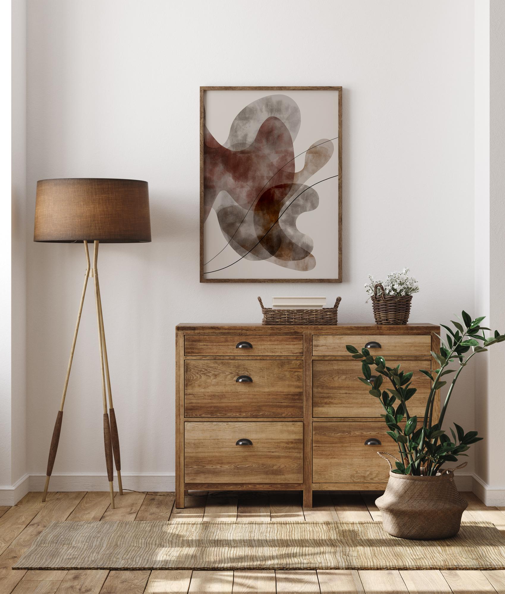 Abstrakti plakatą su keistomis formomis, primenančiomis jūros dumblius, įvairiomis spalvomis. Formos yra užpildytos švelniomis rudomis, pilkomis, rožinėmis ir žaliomis spalvomis su miglotu atspalviu. Dvi linijos dramatiškai sukasi virš centrinių formų, kurios yra padėtos ant balto fono. Derinkite su švelnių pastelinių spalvų fonu, kad gautumėte įdomią pokalbio temą.