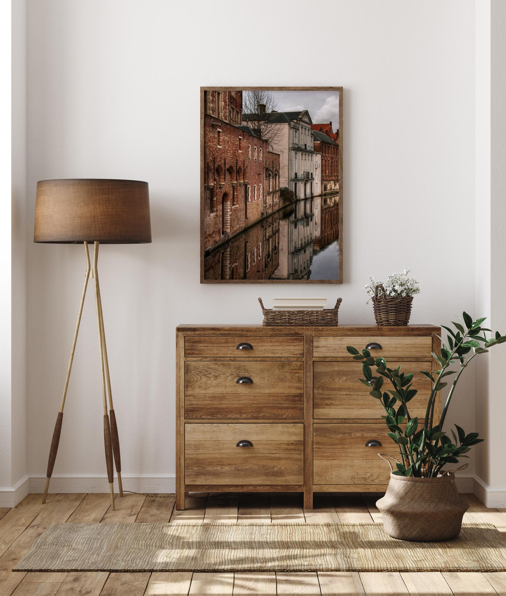 Nostalgiškas plakatas su senų namų eilėmis palei upę. Paprasti, kaimiški, raudoni plytiniai namai ir jų architektūrinės detalės atsispindi ramiame vandenyje apačioje. Įsivaizduokite, kad plūduriuojate palei šiuos pastatus, mąstydami apie praeitį.