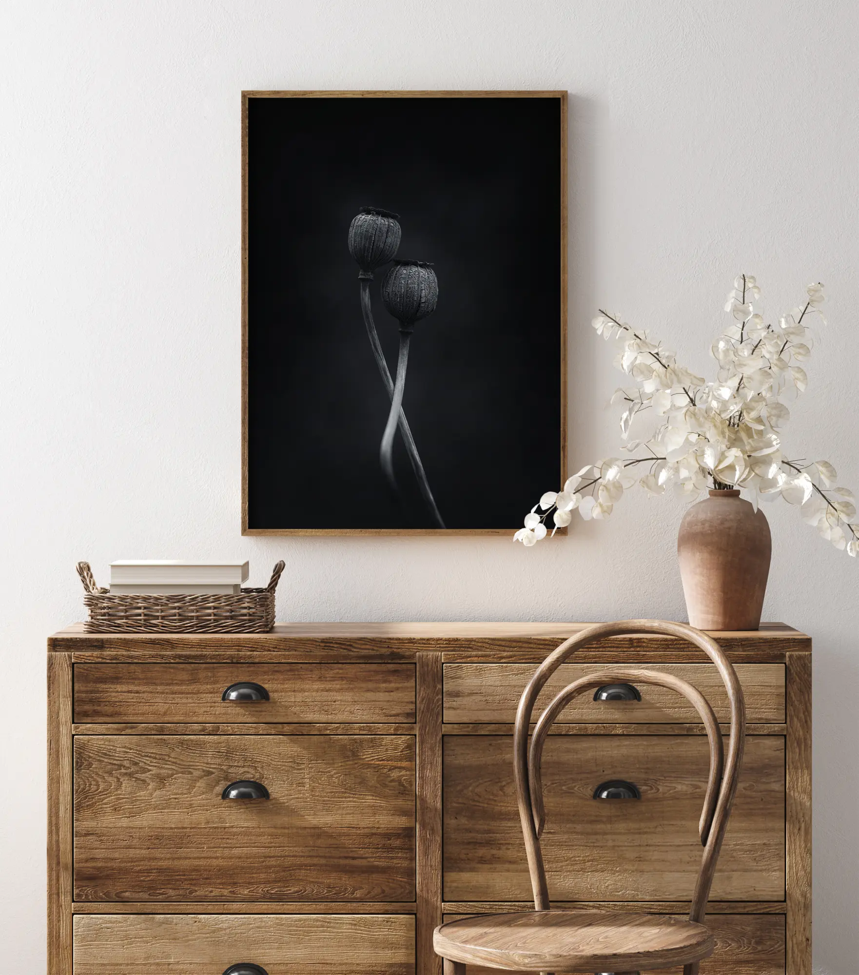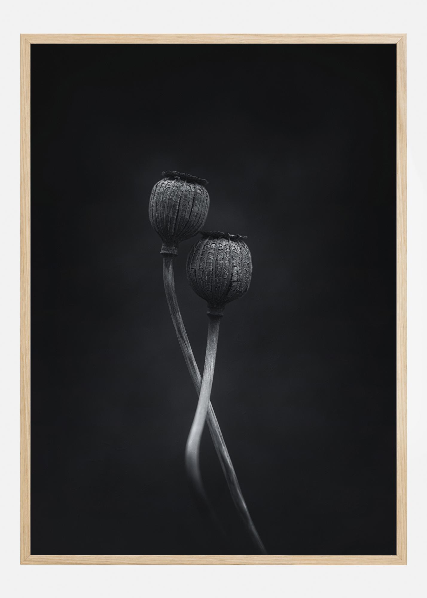 Detališkas gamtos plakatas su dviem susipynusiomis aguonų sėklų kapsulėmis. Ši tapybiška nuotrauka suteikia dviejų šokėjų jausmą. Pajuskite meilę ir eleganciją, kai šį plakatą pakabinsite namuose.