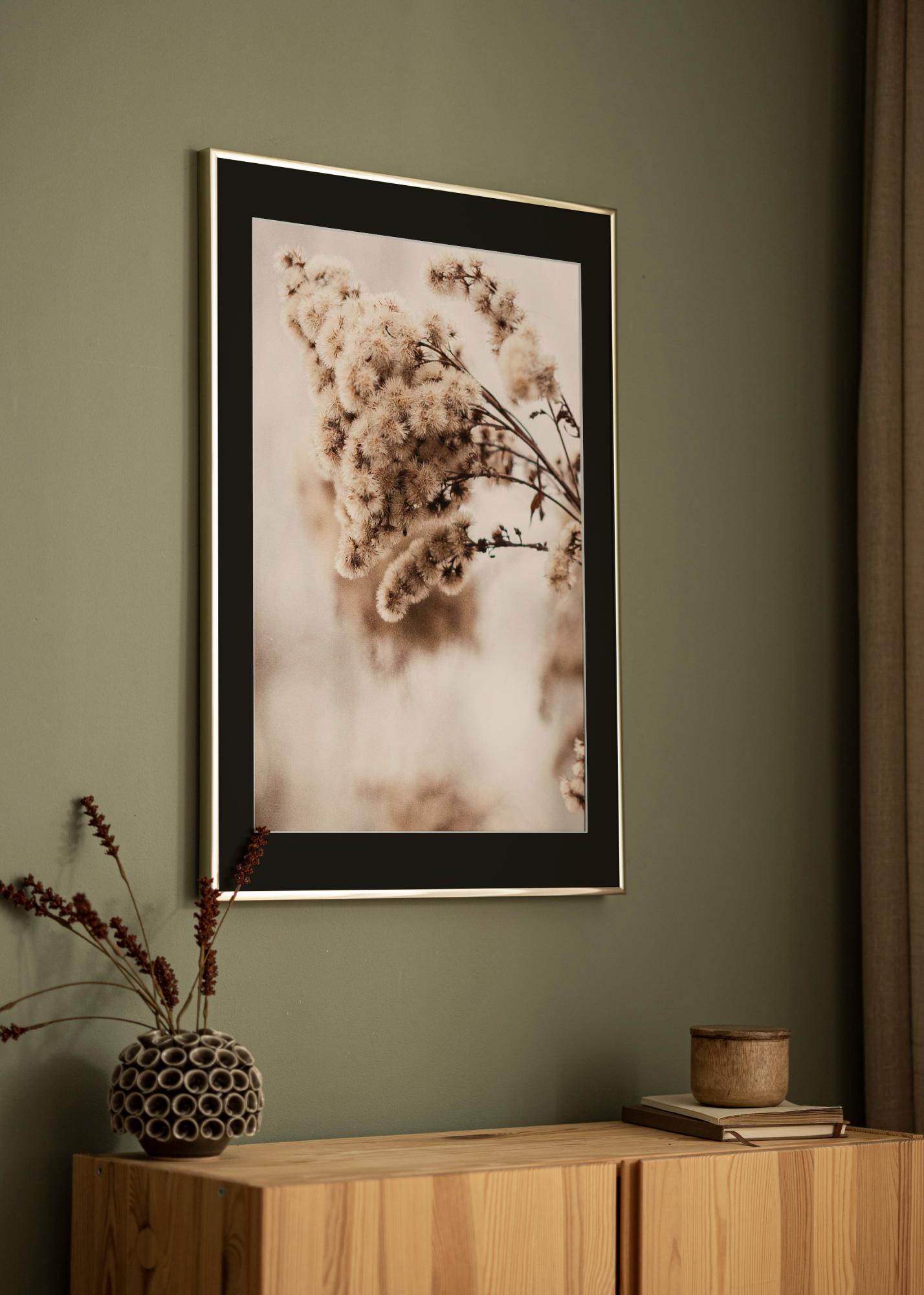 Rėmemas yra blizgus ir subtiliai atspindi šviesą, paryškindamas kontrastą su juodu paspartu. Tai sukuria dramatišką rėmelį ir traukia akį į paveikslo motyvą.