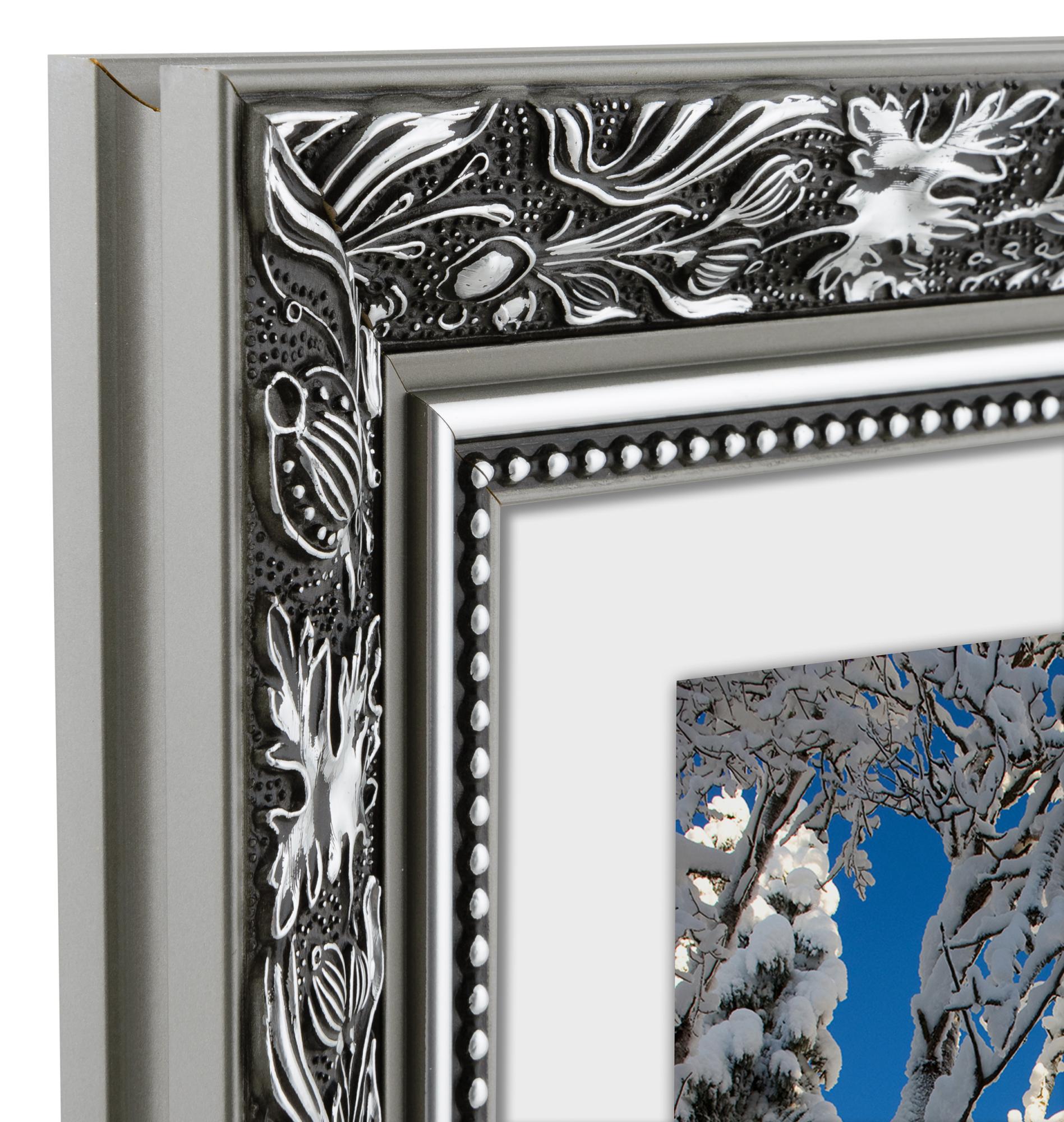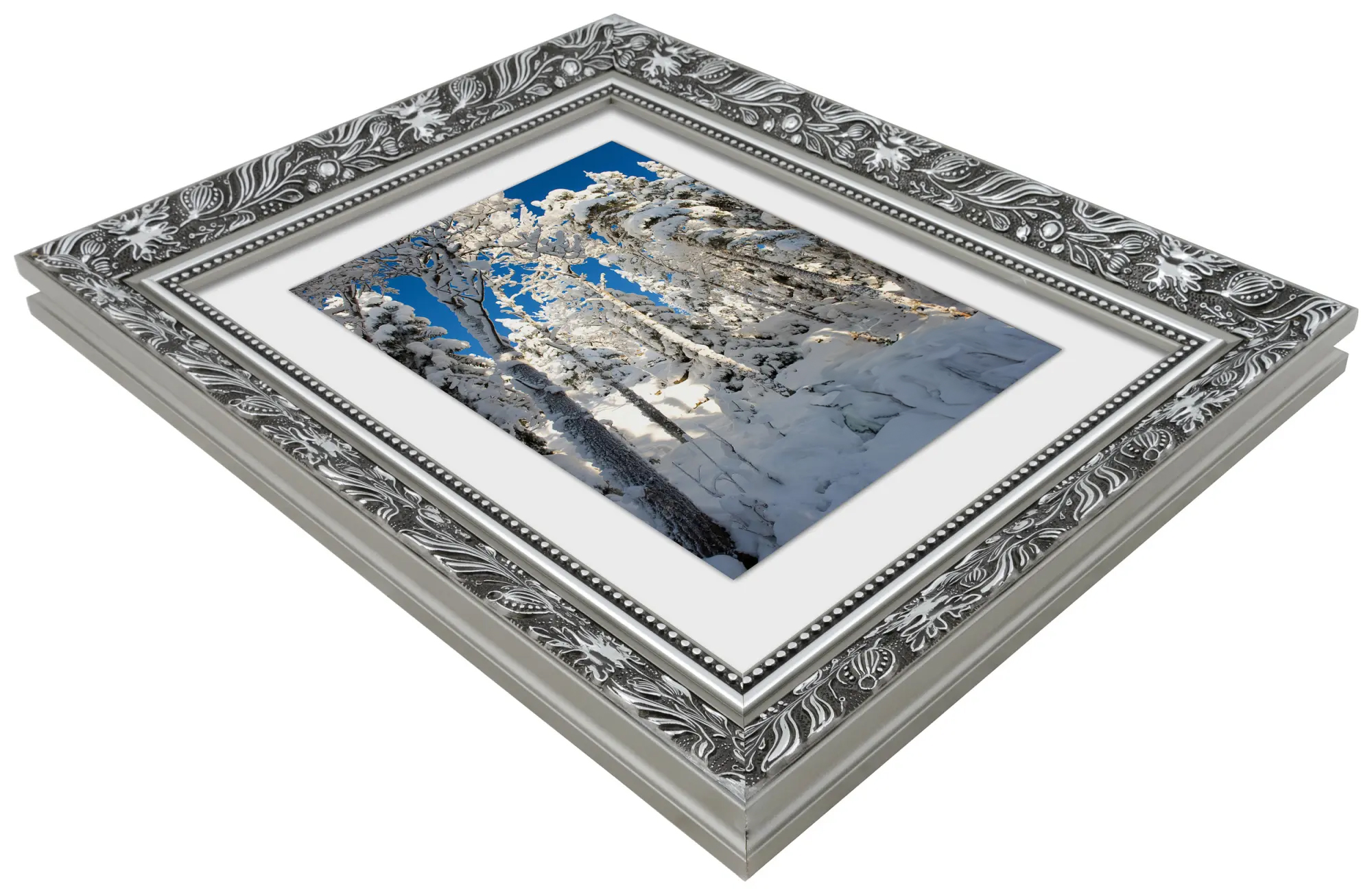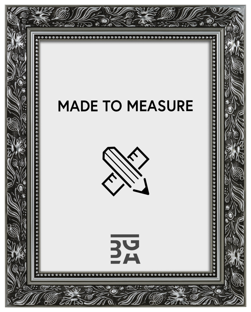 Padarykite sieną prabangia tuo pačiu metu pritraukdami papildomą dėmesį į savo paveikslą! Šis gražus rėmas turi dvigubą profilį, kuris puikiai atrodo ant sienos. Kraštai visiškai sidabriniai, o priekinė dalis juoda ir turi sidabrinį raštą su lapų ir išraižytomis formomis. Artimiausiai stiklo eina sidabrinis kraštas ir juoda dalis su sidabriniu perlų raštu. Kadangi rėmas gaminamas pagal jūsų nurodytus matmenis, galite būti tikri, kad jis tiksliai tiks ten, kur norite.