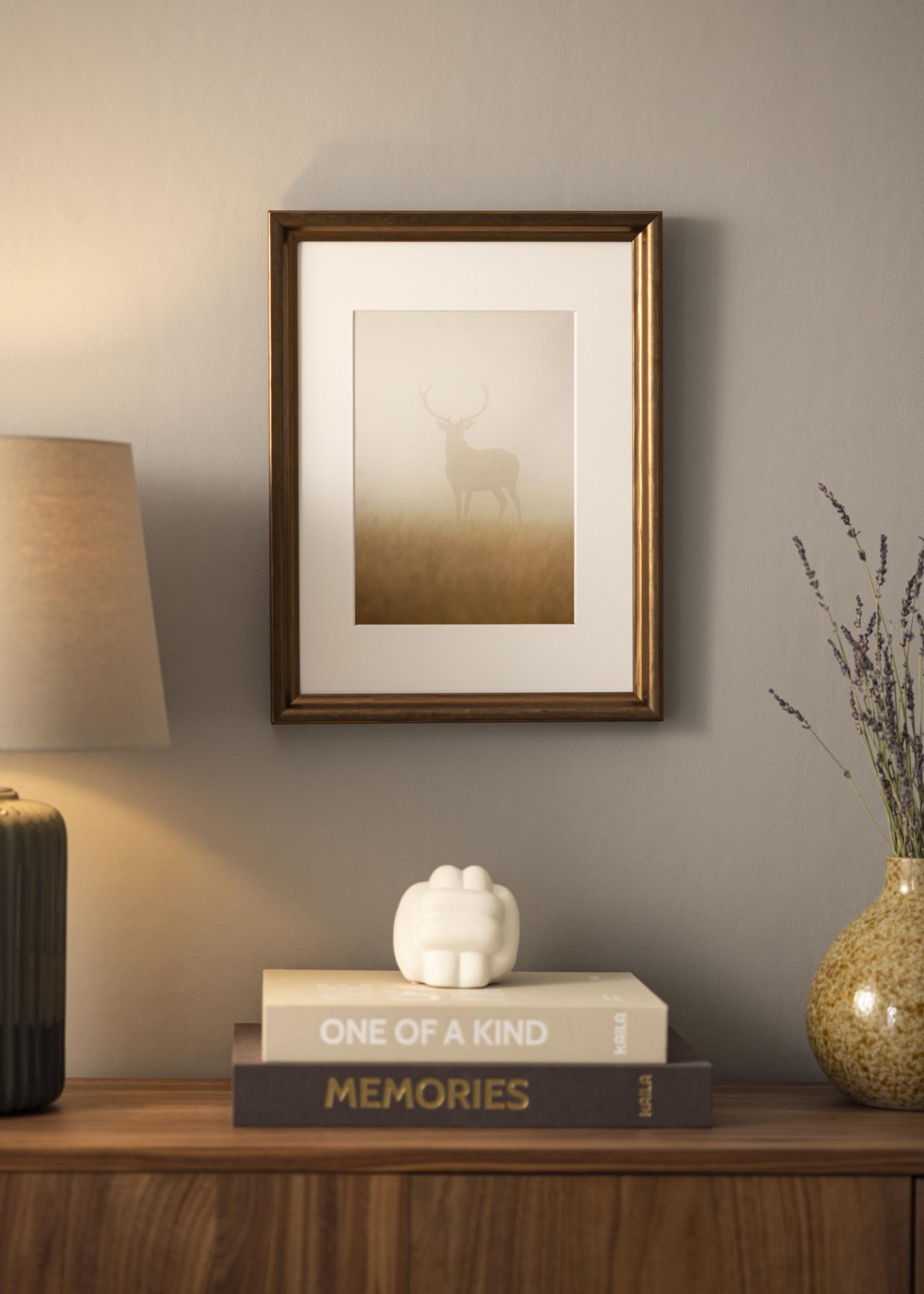 Stilingas rėmas pagal individualius matmenis, turintis sodrią vario spalvą, suteikiančią tvirtą ir išskirtinį įspūdį. Arjeplog Bronzos rėmas nėra tinkamas visiems motyvų tipams, tačiau tam tikriems vaizdams tai puikus pasirinkimas.