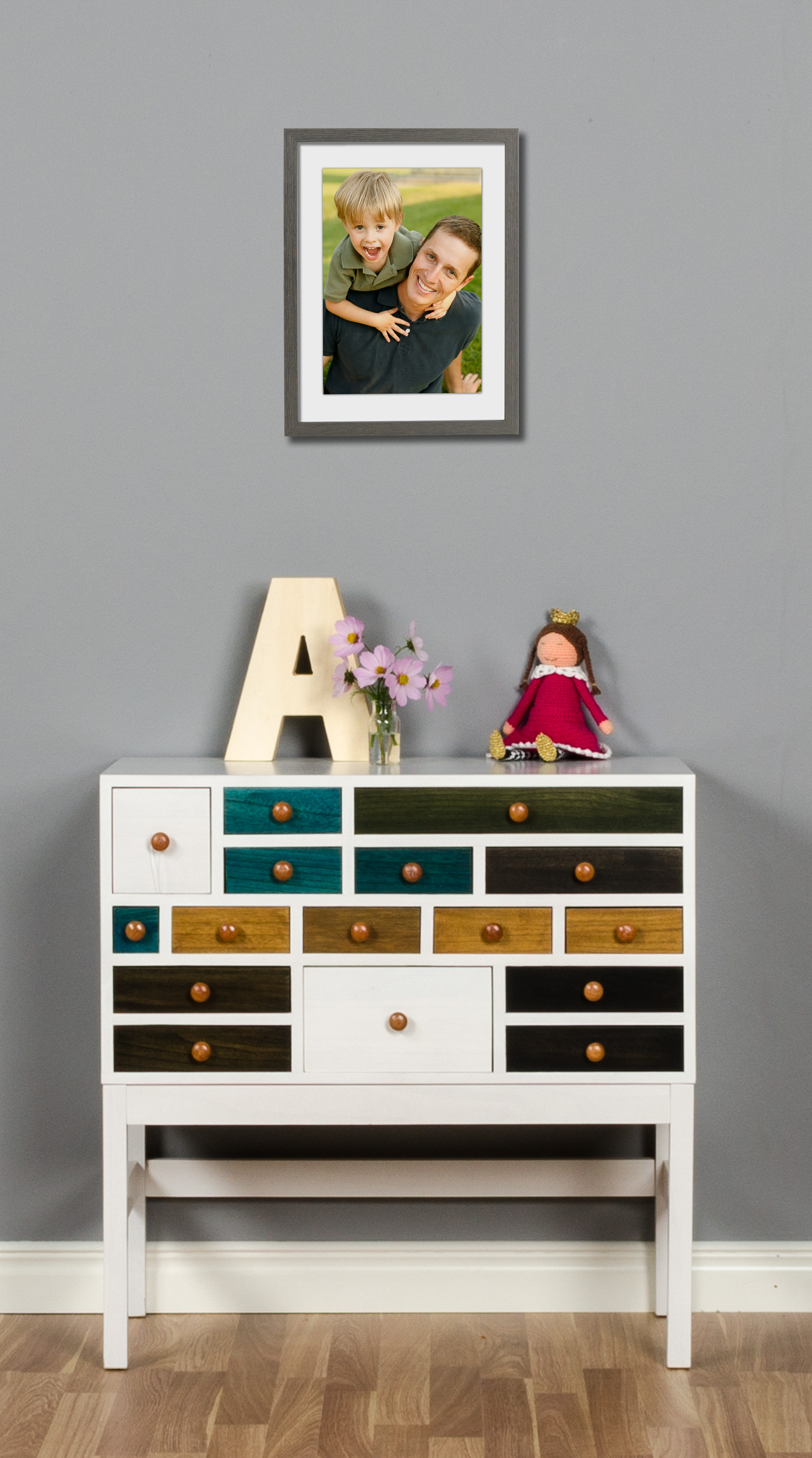 Paverskite savo nuotraukoms charakterį naudodami šį skaniai tekstūruotą paveikslų rėmą! Rėmo spalva yra pusiau padengta, todėl medžio raštas prasiskverbia ir padaro įspūdį įdomesnį. Lentynėlė yra stilingo modelio, kuris gražiai įsilieja į beveik bet kokį interjerą. Žinoma, nugarėlė yra bekislė, todėl galite būti tikri, kad jūsų nuotrauka puikiai laikysis daugelį metų. Rėmas gaminamas patyrusio personalo mūsų pačių rėmų dirbtuvėse.