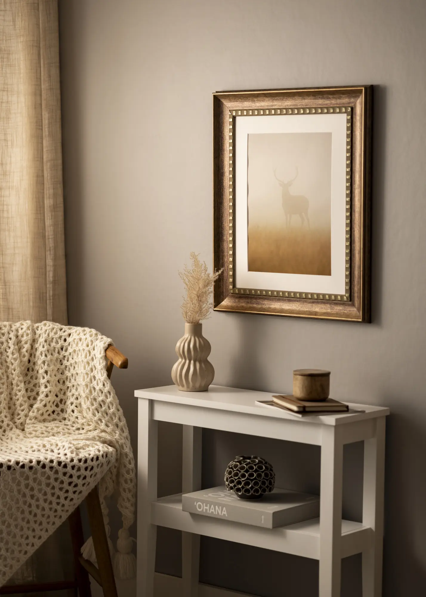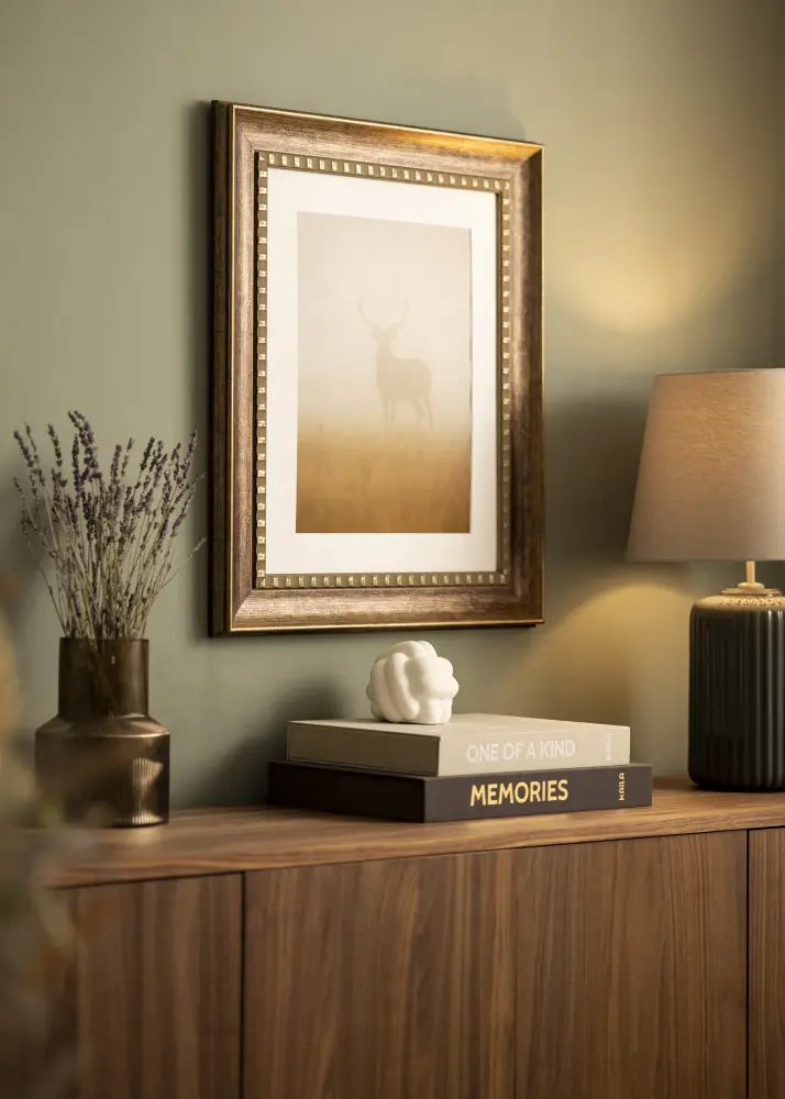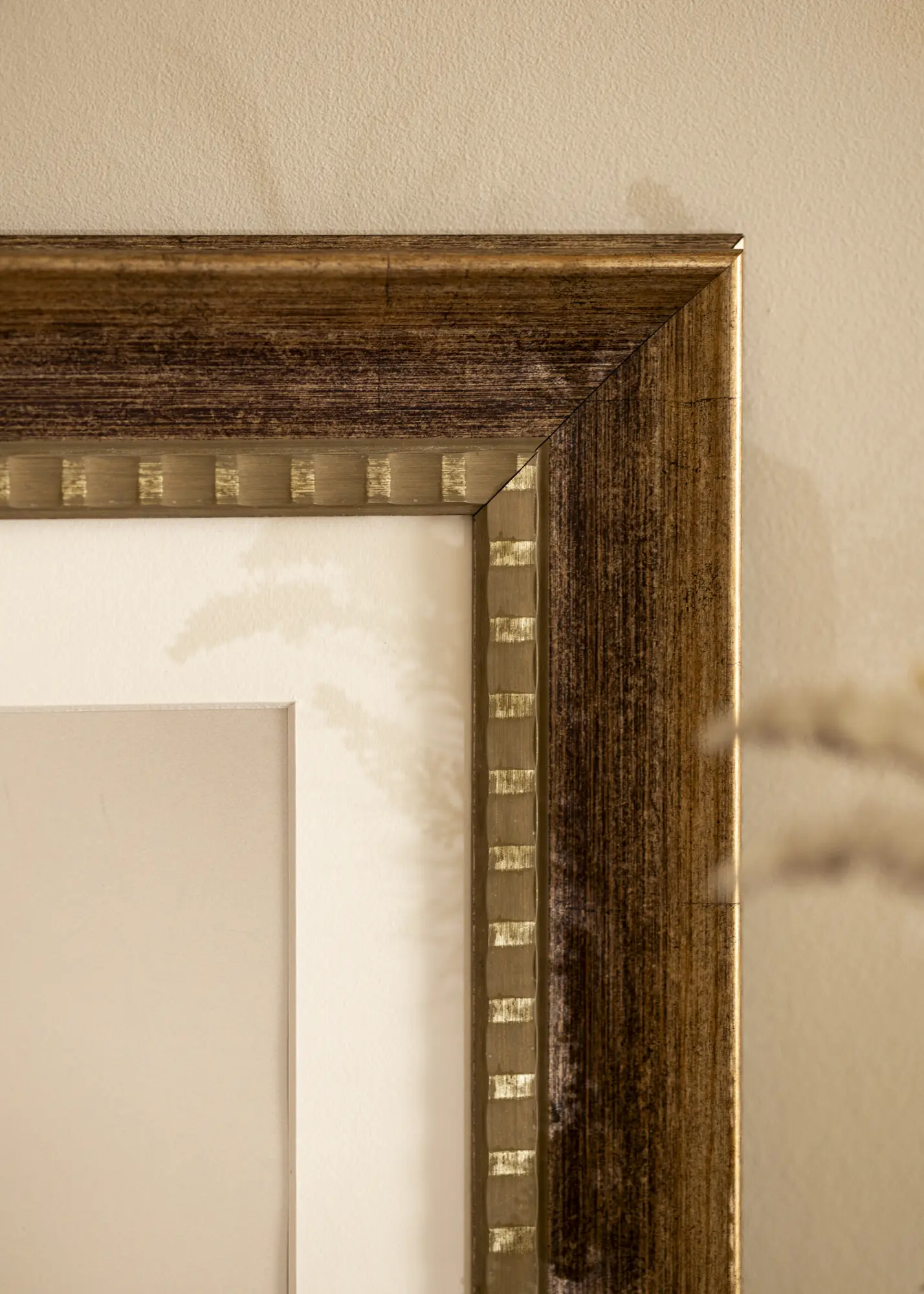 Camden Silver turi šiltą rudą spalvą su subtilia antikine apdaila, suteikiančia jam kaimišką charakterį. Paviršius yra su lengvu medžio grūdėtumu, kuris imituoja natūralią medieną ir sustiprina jo vintažinį išraišką. Dekoratyvinis vidinis kraštas puoštas mažomis, reguliariomis auksinėmis detalėmis, kurios sukuria elegantišką kontrastą su tamsesniu medžio tonu. Išorinis kraštas turi minkštą nuolaidumą su diskrečiu auksiniu apdaila, suteikiančiu paveikslėlio rėmeliui prabangos ir nesenstančio jausmą.