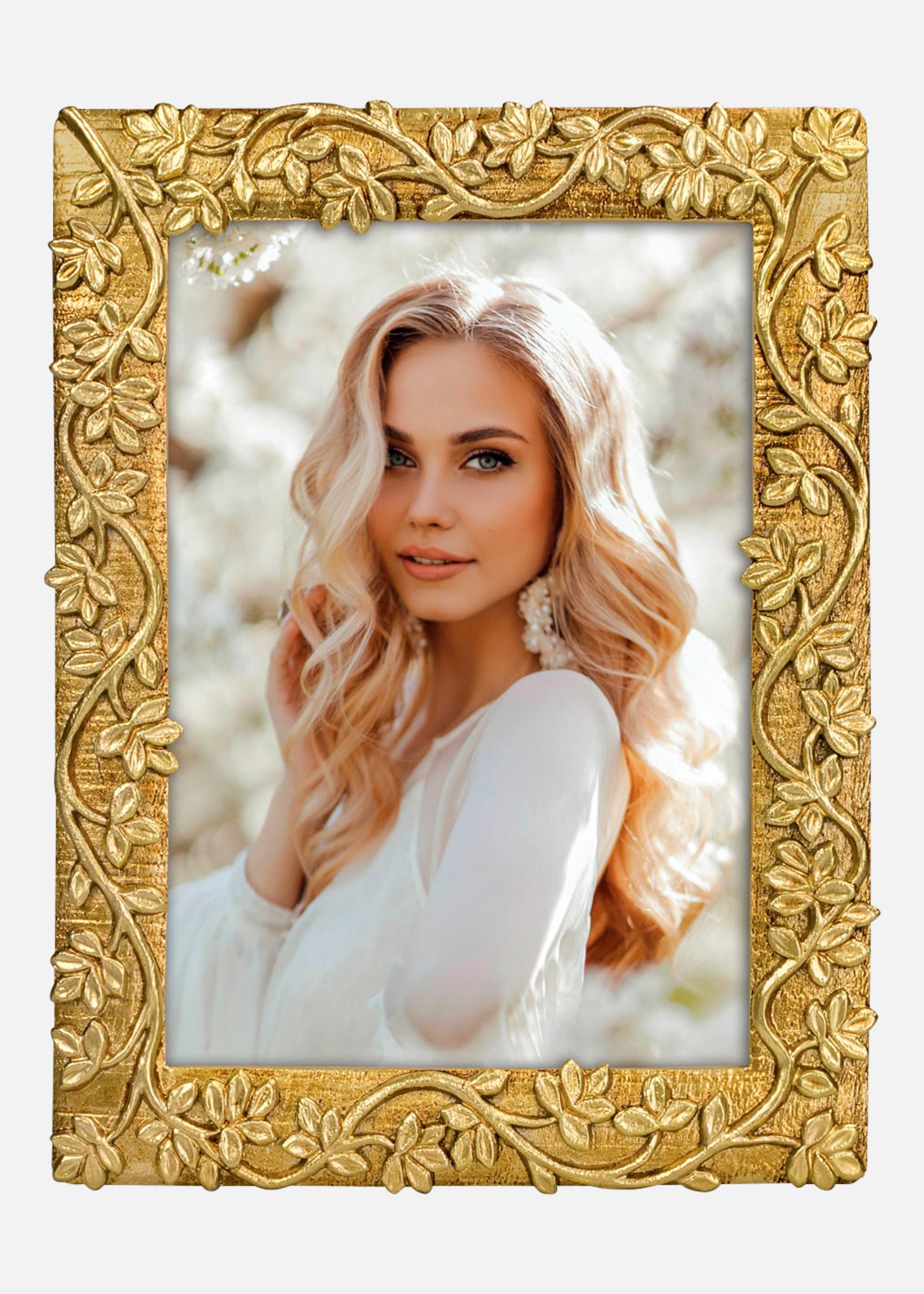 Suteikite savo mėgstamiausioms nuotraukoms karališką apipavidalinimą su šiuo išskirtiniu aukso spalvos portreto rėmeliu. Su savo išsišakojančiais gėlių ornamentais kiekviena nuotrauka tampa meno kūriniu. Rėmo dydis yra 13x18 cm, puikiai tinka pabrėžti jūsų labiausiai mylimas akimirkas.