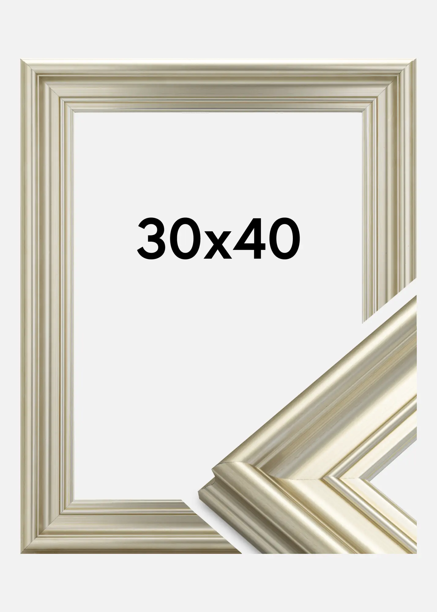 Mora Premium Silver yra vienas iš mūsų geriausių sidabrinių rėmų. Pagamintas iš medienos iš mūsų gražių Švedijos miškų ir surinktas mūsų pačių rėmų dirbtuvėse. Tai leidžia mums garantuoti kokybę, kuri viršija įprastą. Rėmas turi švelniai sidabro spalvos profilį senoviniu dažytos stiliaus su net 57 mm pločiu. Puikiai tinka jūsų gražiausioms nuotraukoms!