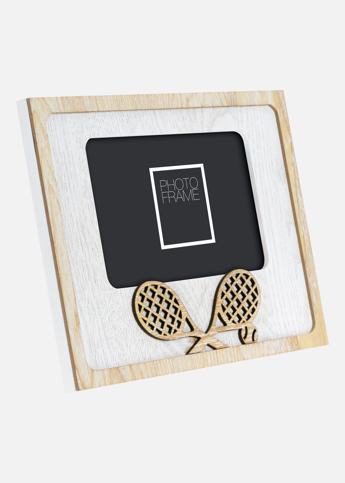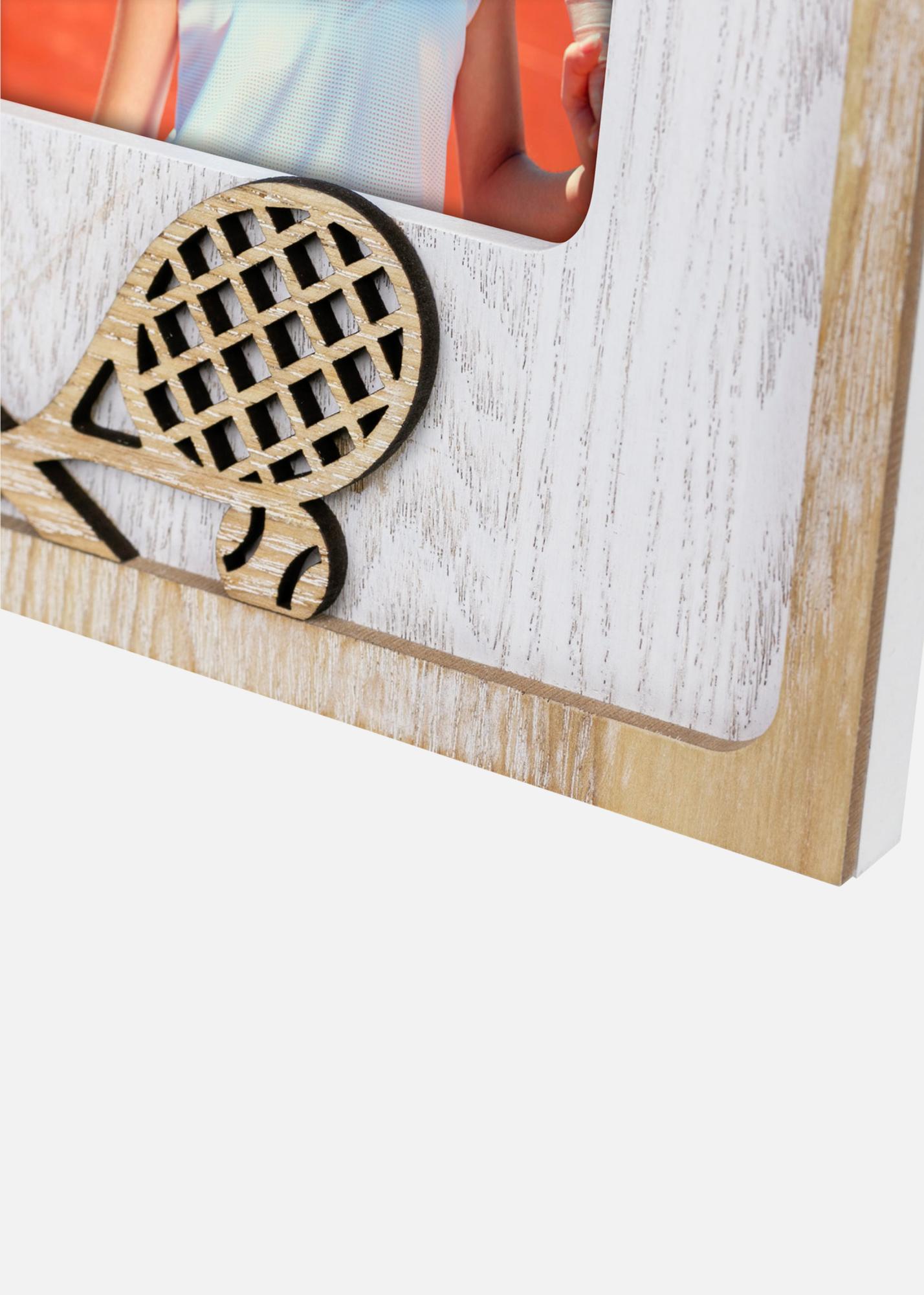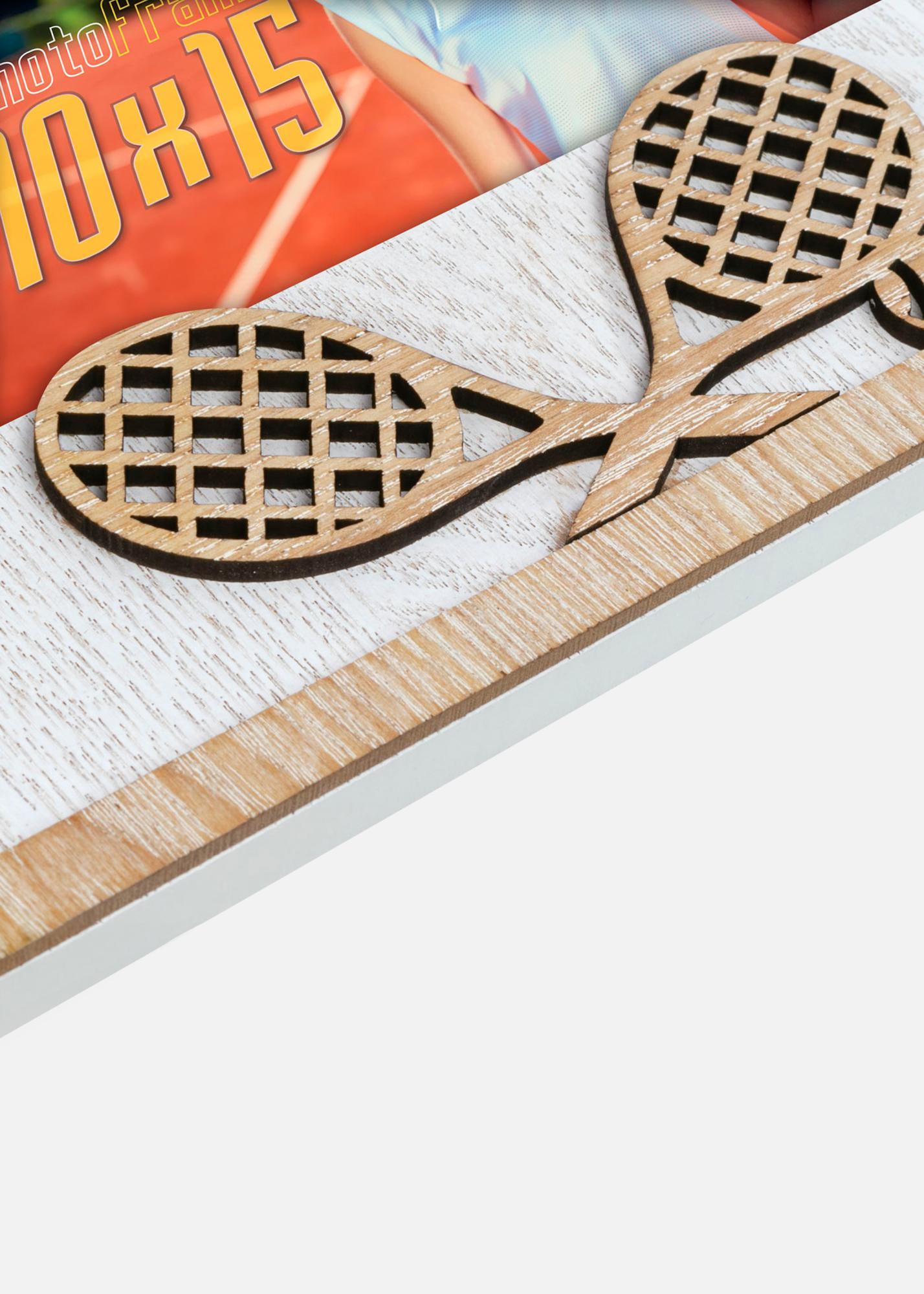 Sporto įkvėptas nuotraukų rėmelis su teniso tema. Dekoruotas išpjautais teniso raketėmis, puikiai tinka įrėminti prisiminimus iš teniso aikštės ar sportinių veiklų. Tinka 10x15 cm dydžio nuotraukoms.