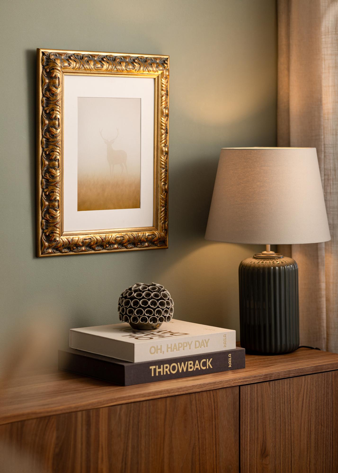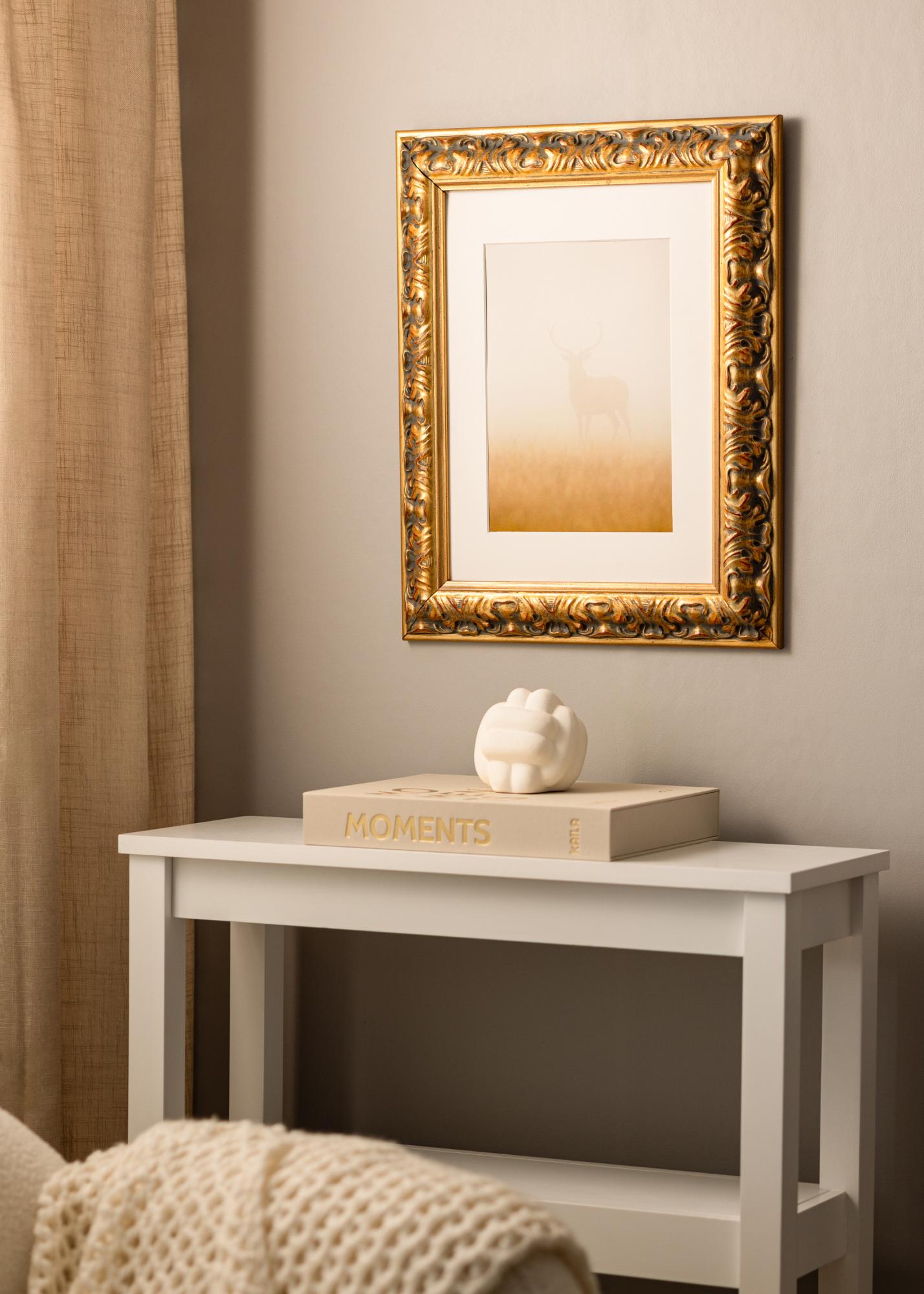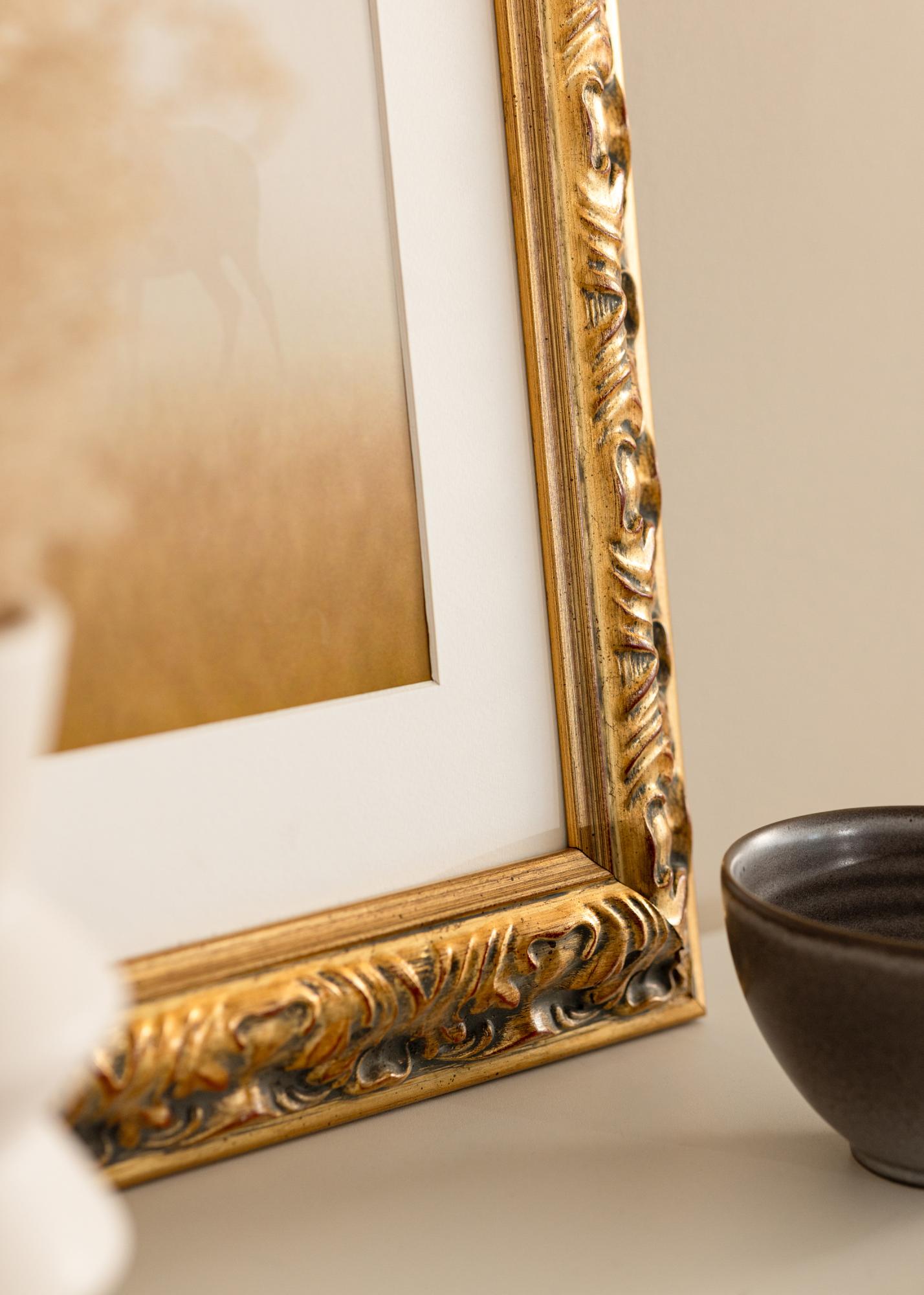 64 mm pločio rėmo juosta yra pagaminta iš pušies ir turi 38,5 mm gylį, kas suteikia rėmui tvirtą ir solidų pojūtį. Reljefu iškaltos skulptūrinės detalės pabrėžiamos subtiliu kontrastu tarp aukso ir tamsių akcentų, o išraiškingi raudoni elementai suteikia visumai gylį ir charakterį. Šių elementų derinys sukuria baroko stilių, kuris tinka tiek klasikinei, tiek moderniai aplinkai.