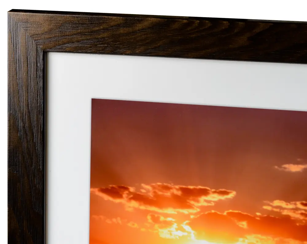 Tvirti rudi mediniai rėmai su matomomis medienos gyslomis ir plačiu profiliu. Puikiai tinka, jei ieškote tamsaus medinio rėmo su natūraliu pojūčiu. Puikiai tinka aplinkos ir peizažų nuotraukoms.