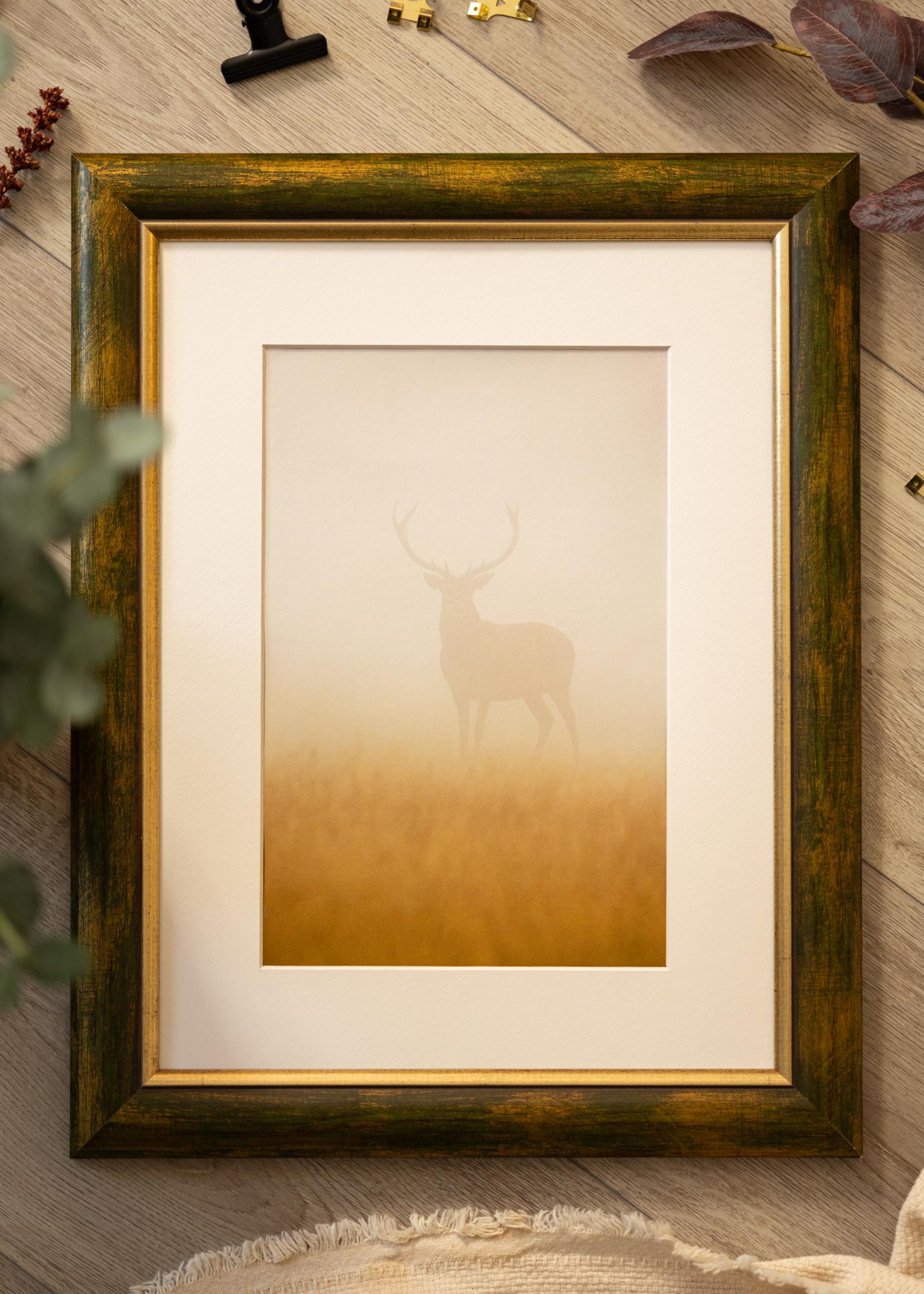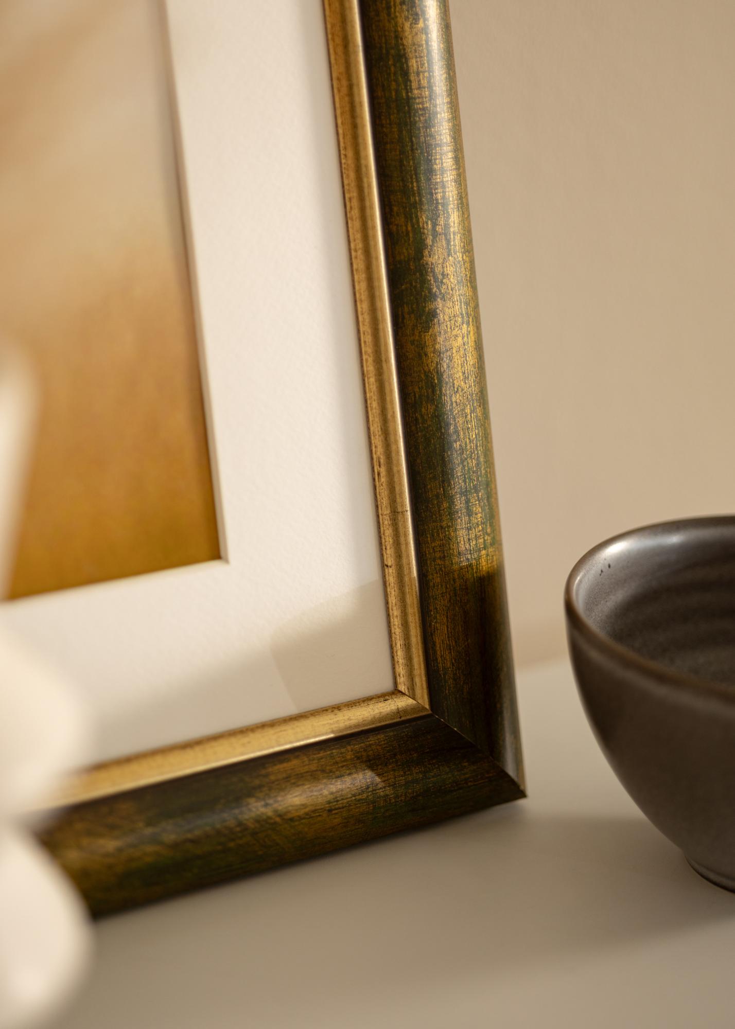 Laiko neišblunkantis medinis rėmas, pagamintas Suomijoje, su elegantišku žalsvai tonuotu medžio paviršiumi ir aukso spalvos kraštu arti motyvo. Suteikia harmoningą jausmą motyvui. Rėmas turi plačią 41 mm profilį ir 19 mm gylį, kuris suteikia papildomo gylio įrėminimui.