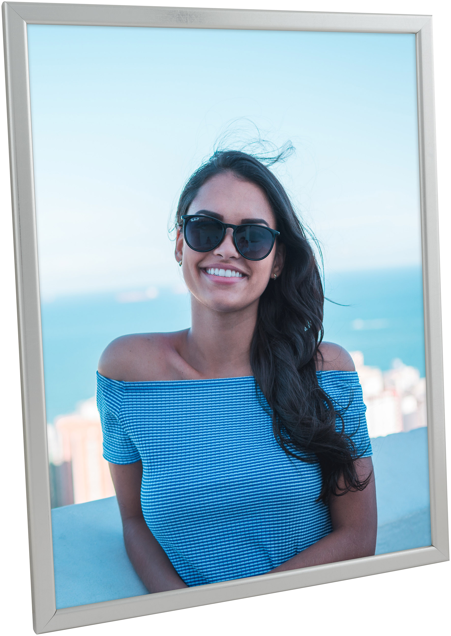 Įdėkite savo nuotrauką, paveikslą ar plakatą į šį stilingą rėmą! Rėmas pagamintas iš sidabru dažyto medžio ir turi antirefleksinį stiklą. Nugarinė dalis ir atrama yra apvilkti juodos odos imitacija, suteikiančia papildomą prabangos pojūtį.