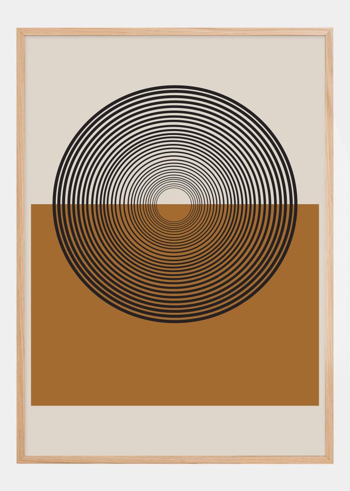 Šis stilingas plakatas patraukia akį savo hipnotizuojančiu juodų linijų raštu, sukuriančiu išskirtinę optinę iliuziją, esančią priešais turtingą ochros foną, kuris atspindi kraštovaizdžio horizontą. Viršutinė pusė apskritimo formos suteikia saulėlydžio ar mėnulio patekėjimo pojūtį, o besisukančios linijos kuria judesio ir gylio jausmą, suteikdamos šiam meno kūriniui retro atmosferą su modernia vingi.