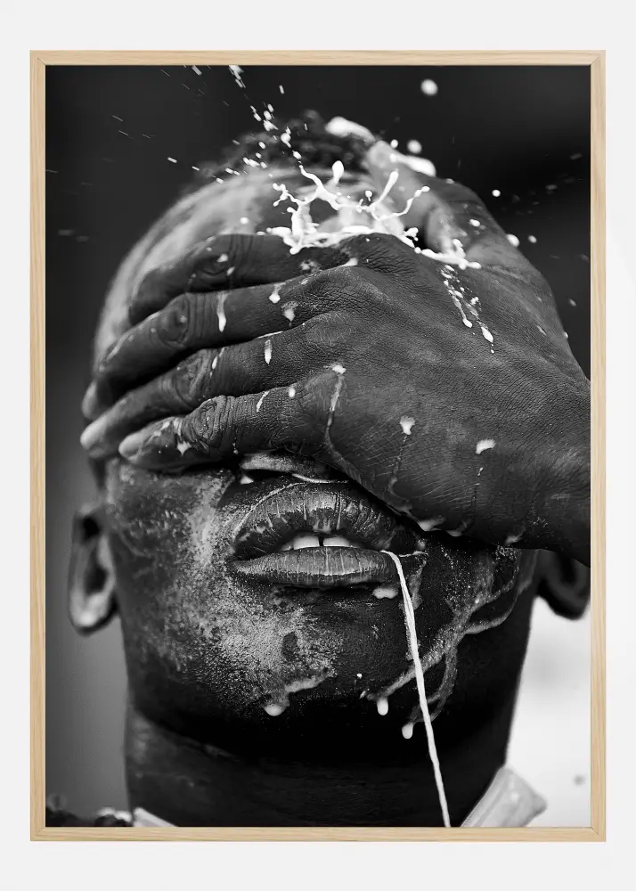 Stambaus plano plakatas su žmogaus portretu, kuris dengia savo veidą ranka. Balti pieno purslai, atrodo, krenta nuo viršaus ir tiška ant jo veido, lašai atšoka ore. Su šiek tiek pravera burna, ši nuotrauka yra įdomi ir detali studija, kurią galėsite žavėtis valandų valandas.