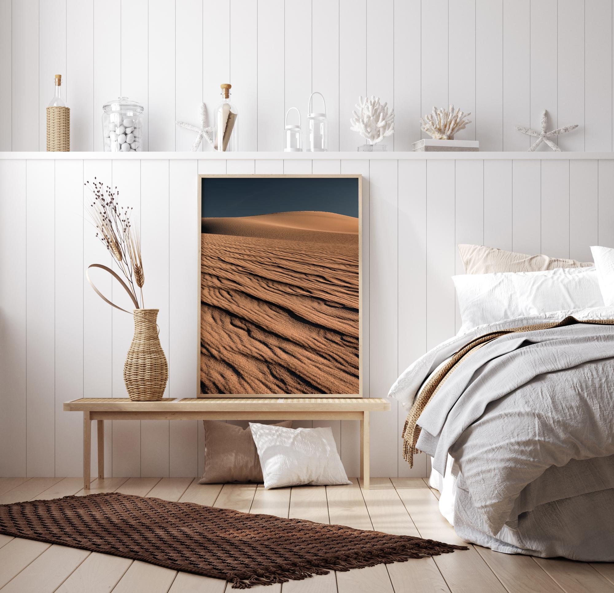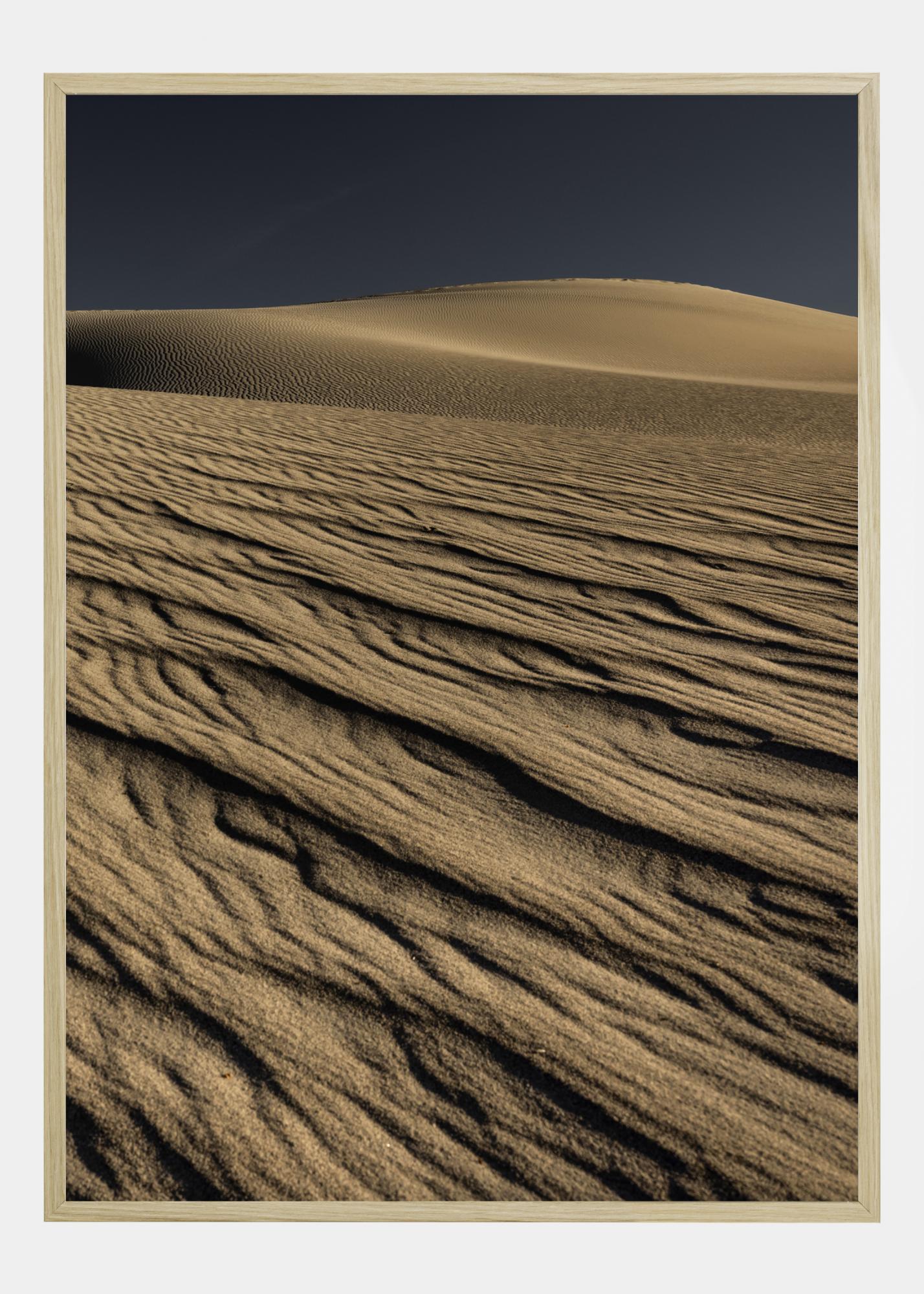 Įspūdingas plakatas su smėlio bangomis ant kopų. Ši nuostabi nuotrauka sukuria harmoniją tarp kontrastingo geltono smėlio ir mėlyno dangaus. Įsigykite šiek tiek dramos ir leiskite žvilgsniui keliauti per šį vaizdą.