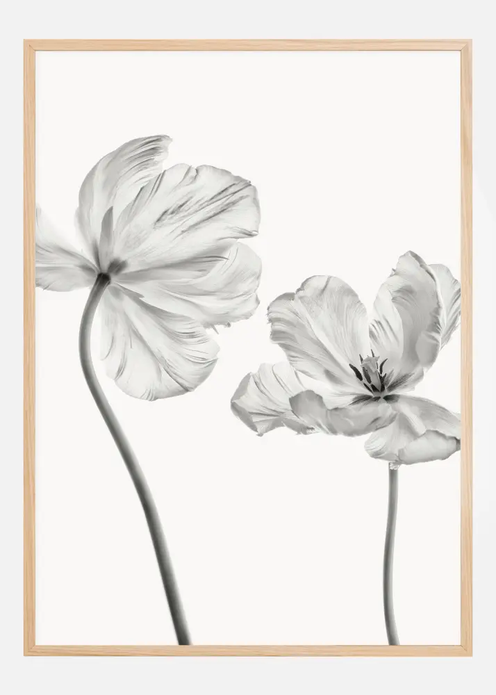 Paprastas plakatas su dviem tulpėmis. Švelniai juodai balta dizaino spalva rodoma viena tulpe, matoma priekyje, kita iš nugaros. Paveikslėlis užfiksuoja visas elegantiškas žiedlapių detales subtiliame portrete.