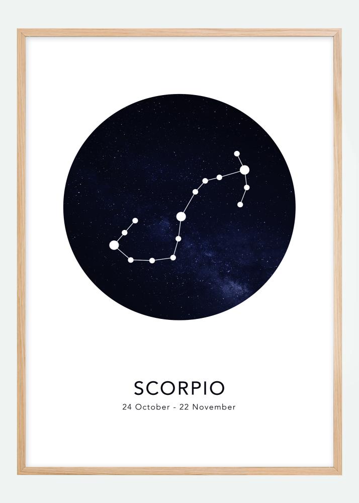Padovanokite asmeninį paveikslą žmogui, kurį mylite! Ši stilinga plakatas vaizduoja Skorpiono žvaigždyną juodos ir mėlynos spalvos žvaigždėtos dangaus fone. Apačioje yra vardas kartu su atitinkama data anglų kalba.