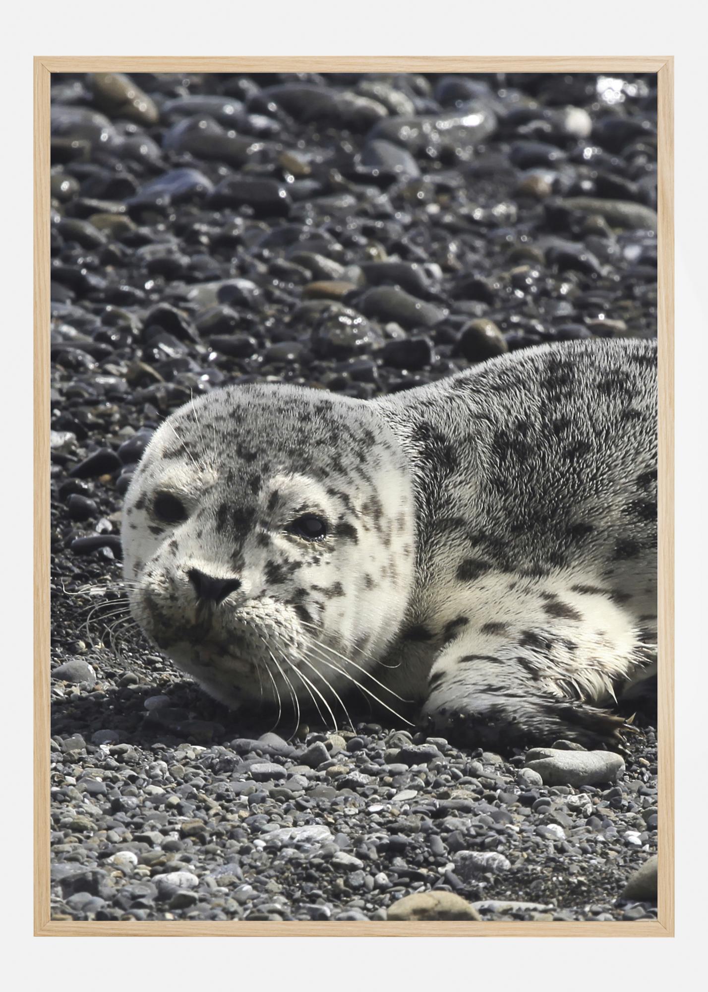 Gražus gyvūnų plakatas su ruoniu ant uolėtos pakrantės. Pilkasis ruonis guli ant uolų, beveik visiškai užmaskuotas. Dėmės ant jo kailio atspindi už jo esančius akmenis. Pažvelk į šio jūrų žinduolio sielingas akis, kai parsiveži šį vaizdą namo.