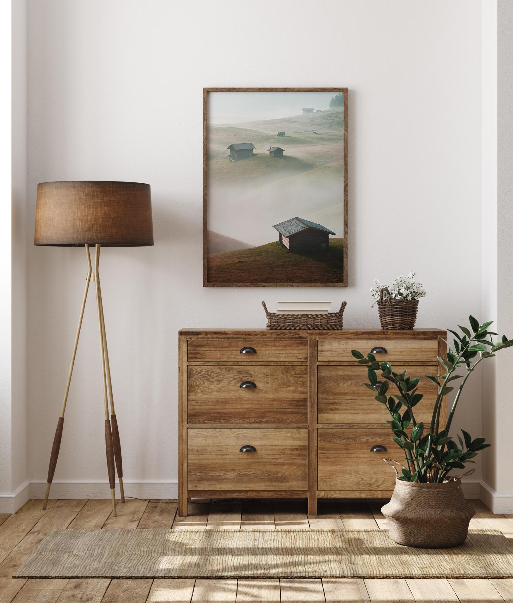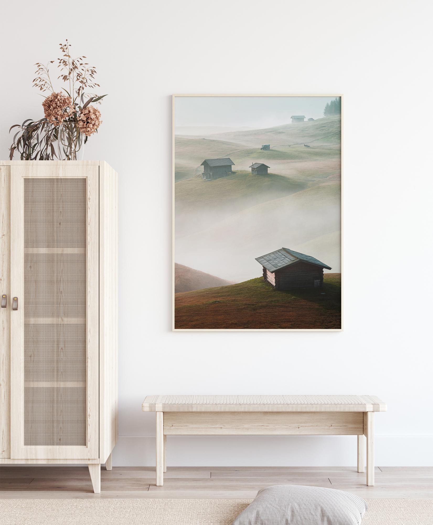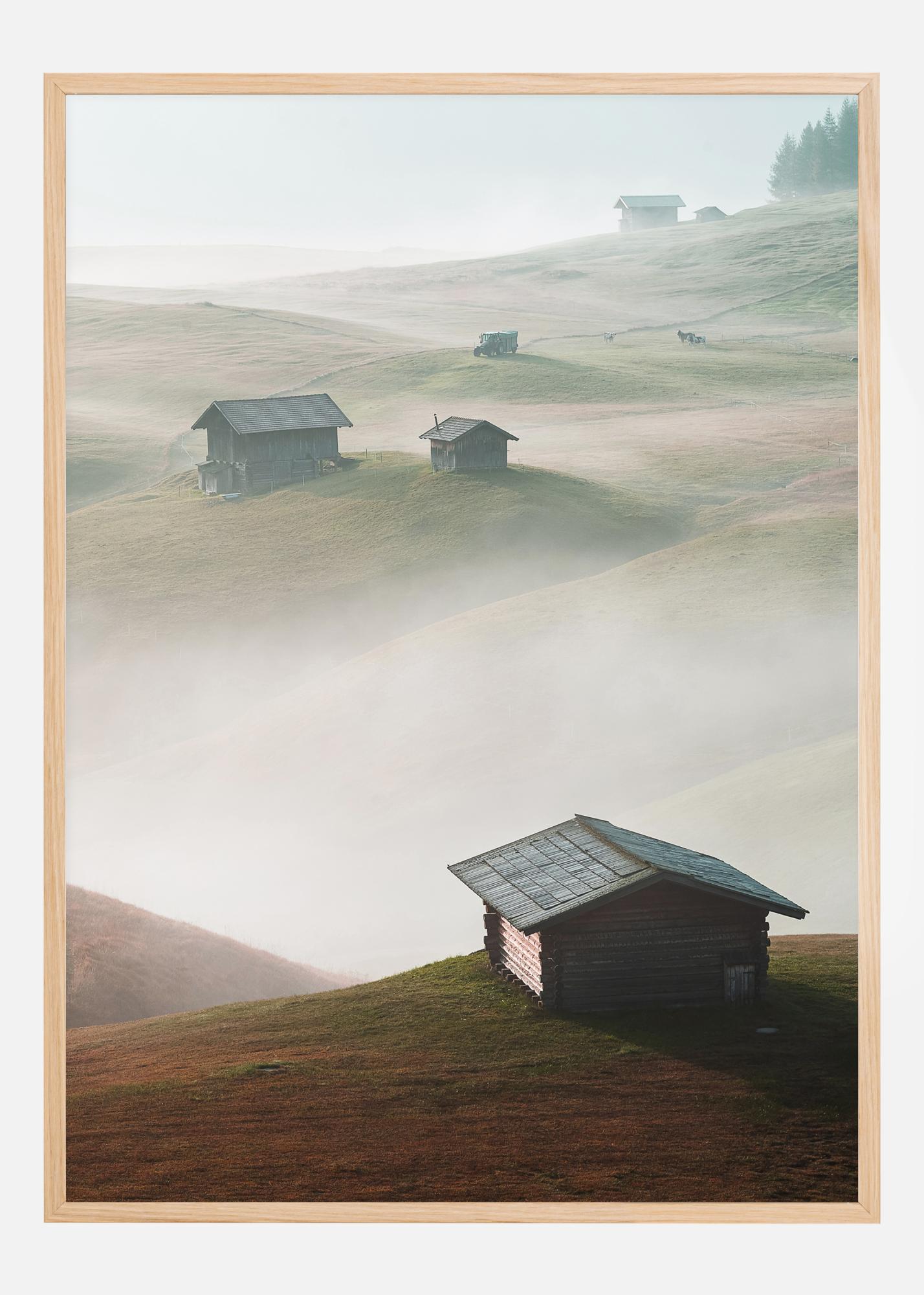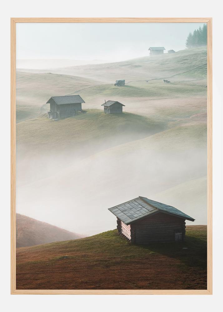 Magiškas plakatas su namais, stovinčiais ant kalvų, kylančių virš rūko ir debesų apačioje. Kiekviena maža trobelė išsiskiria ant banguojančių žalių kalvų. Rūkas tarp namų juos paverčia lyg salomis, tarytum atskiria vieną nuo kito. Pasinerkite į šį plačiai besidriekiančią vaizdą.