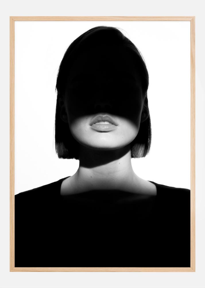 Šis įspūdingas plakatas užfiksuoja galingą moters, kurios akys yra paslėptos tamsaus šešėlio, vaizdą, suteikiantį paslaptingą ir mąstyti skatinantį efektą. Aštrus kontrastas tarp baltų akcentų ir gilių juodų tonų pabrėžia jos ryškius lūpas ir skulptūrinius veido bruožus. Tai vaizdas, kuris balansuoja tarp matomumo ir anonimiškumo, šviesos ir tamsos, ir skatina žiūrovą ieškoti gilesnių prasmių.