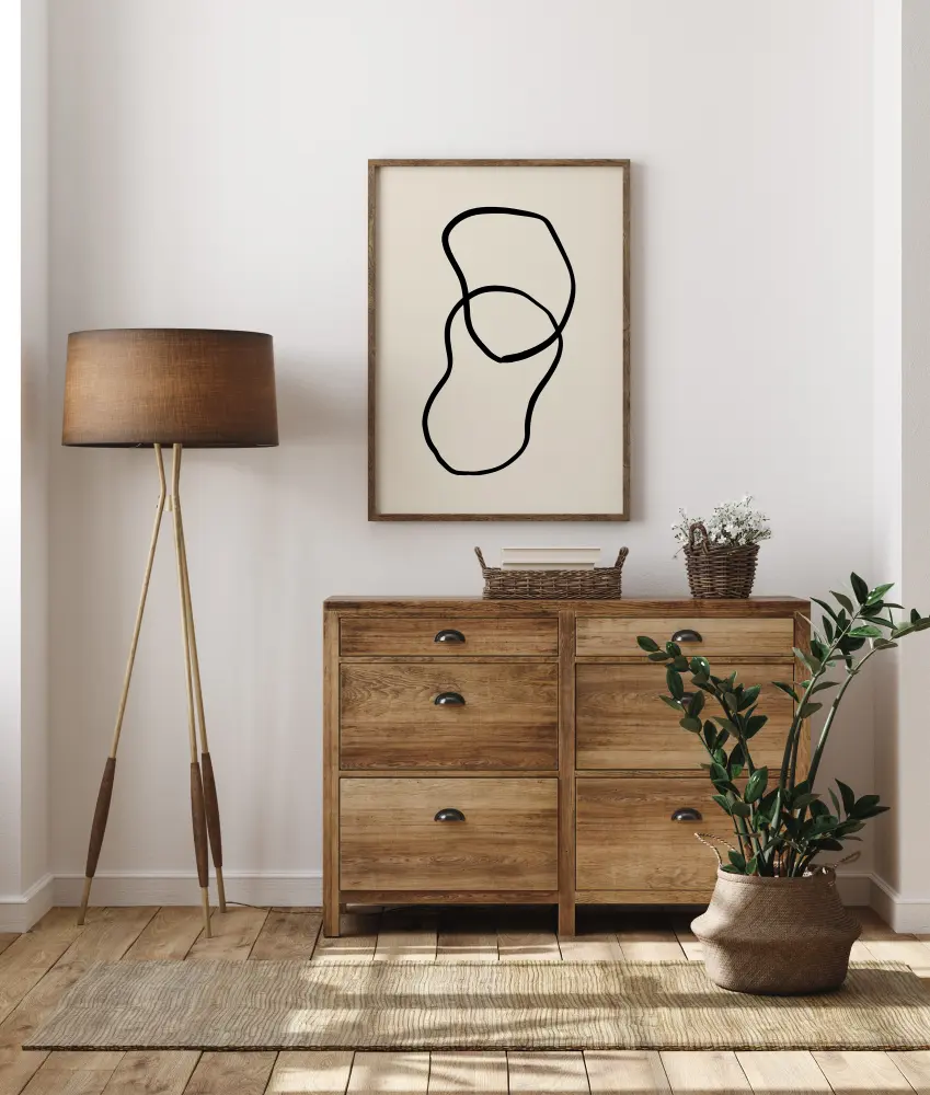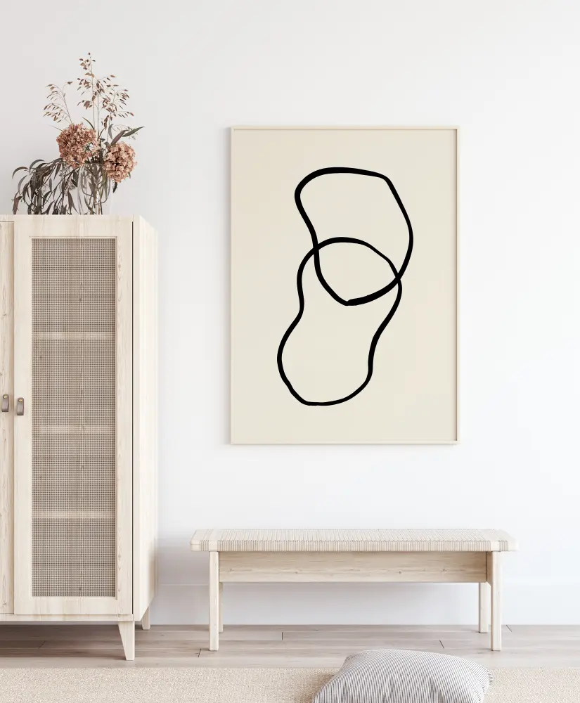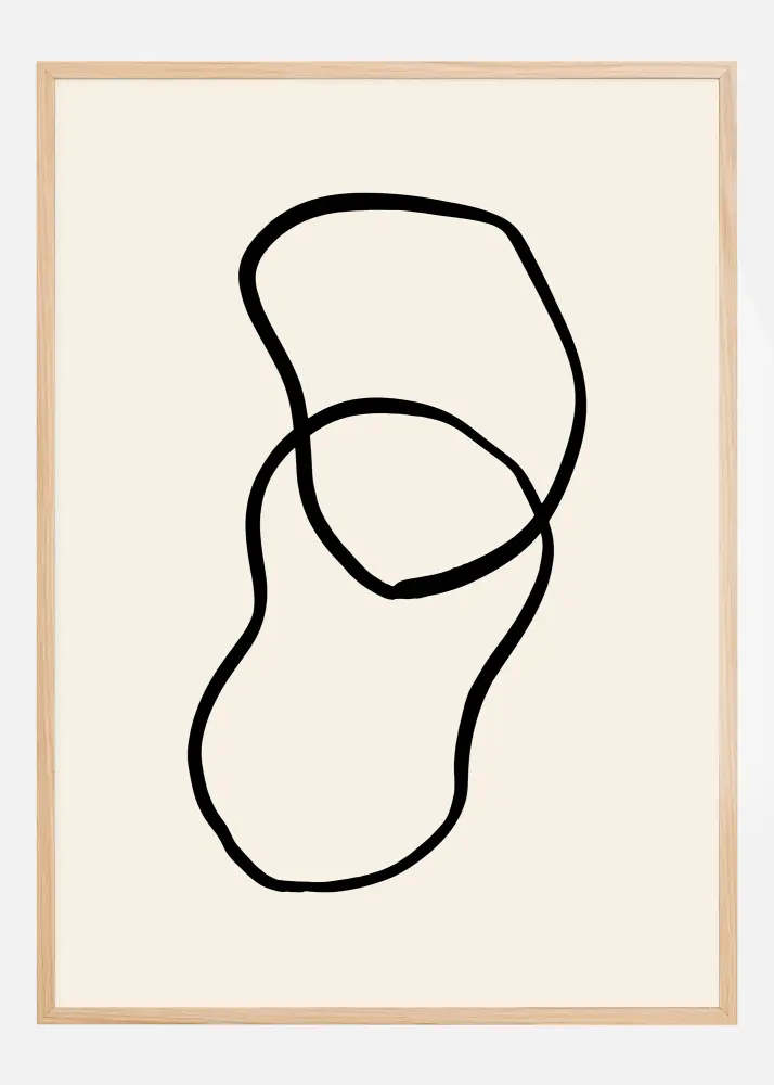 Abstraktus plakatas su dviem formomis, kurios susipina tarpusavyje. Dvi gremėzdiškos formos nupieštos storomis juodomis linijomis ir susikerta, kad sukurtų trečią formą. Pakabinkite šį smagų juodai baltą vaizdą ant spalvotos sienos, kad namuose jaustumėtės kaip modernus menas.
