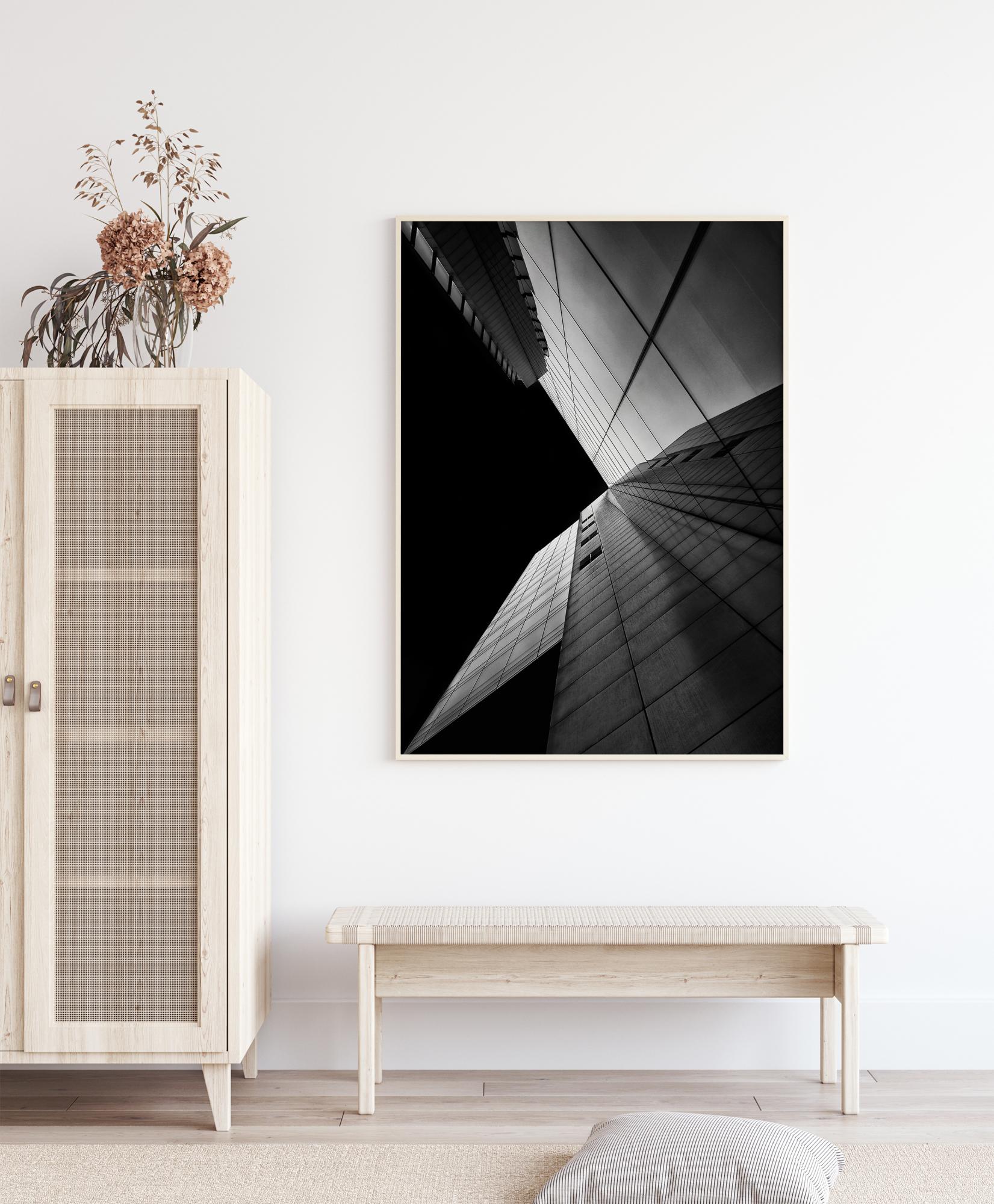 Architektūrinis nespalvotas plakatas su pastato šonu naktį. Geometrinės linijos languose veda akį į vaizdo centrą. Ryškūs balti pastatai atsispindi stikle, o nakties dangus sudaro stiprų kontrastą su pastato šonu. Derinkite su spalvinga siena, kad maksimaliai padidintumėte kontrastą.