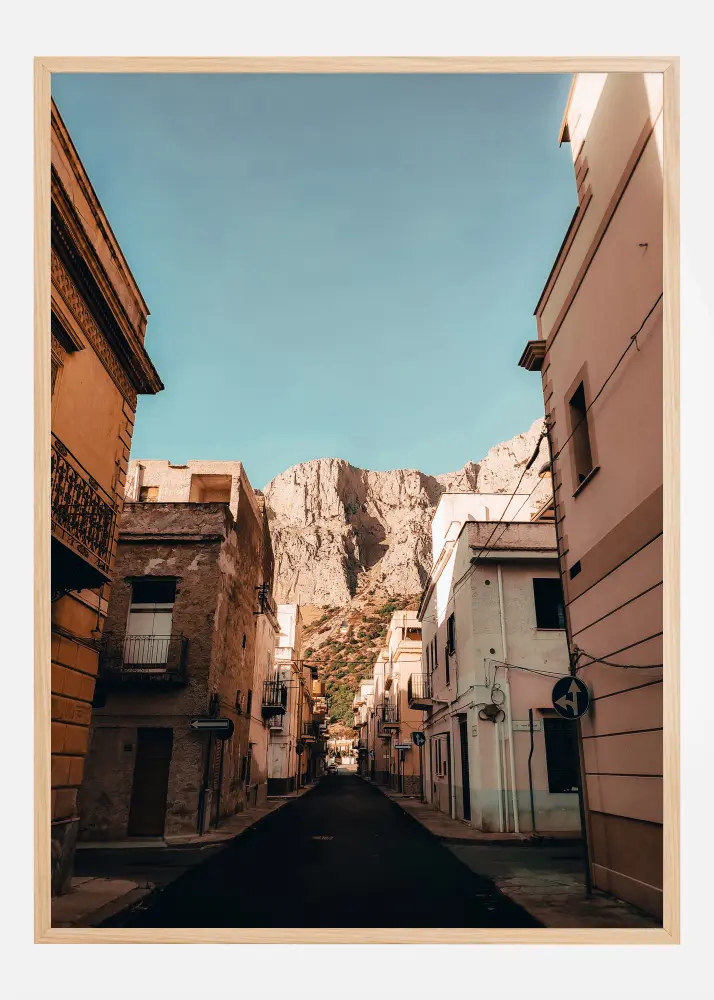 Šis kerintis plakatas perteikia vaizdingos gatvės Sicilijos kaime Cinisi esmę, su šiltomis žemės spalvomis ir įspūdingu kalnu, kylančiu prieš giedrą mėlyną dangų, fone. Pastatų švelniai rožiniai ir geltoni tonai gražiai kontrastuoja su neapdorotu kalnų peizažu fone ir sukuria ramią bei ramybės kupiną atmosferą. Šis spausdinys yra pagarbos ženklas Sicilijos kaimiškam žavesiui ir jos sugebėjimui sujungti gamtą ir kultūrą į harmoninga visumą.