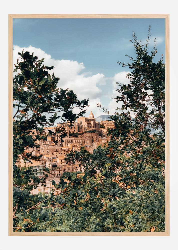 Šis detaliai atvaizduotas plakatas prikausto žvilgsnį gyvu viduramžių miesto vaizdu, kuris kyla aukštyn link debesuoto ir mėlyno dangaus. Miestas, įsikūręs Sicilijos širdyje, yra turtingas istorija ir kultūra, kuri atsispindi šiltų atspalvių pastatuose ir istoriniuose bažnyčių bokštuose. Apsuptas vešlia lapija, šis plakatas sukelia jausmą, kad atrandate paslėptą perlą, vietą, kur kiekvienas akmuo ir stogas turi savo istoriją.