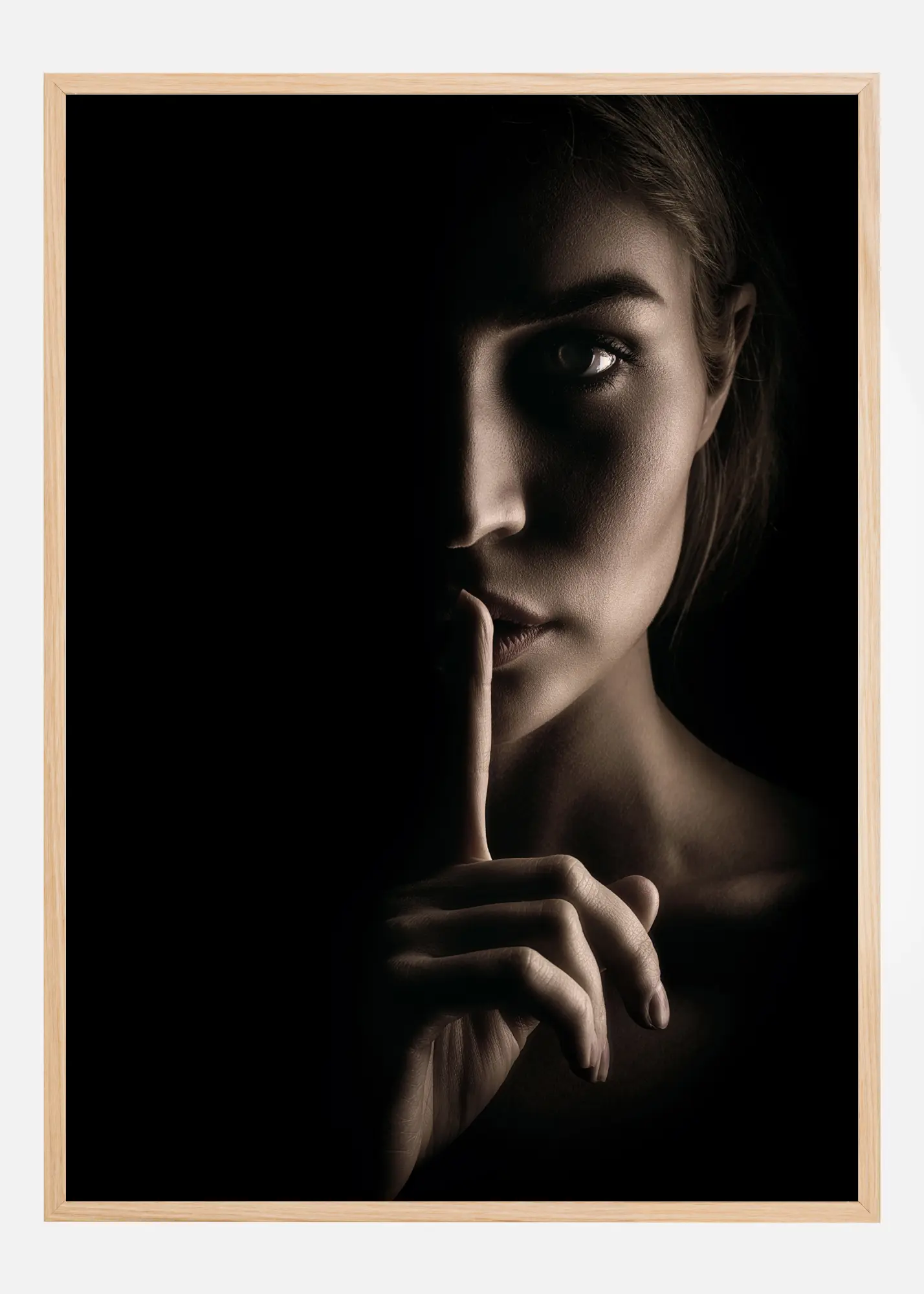 Mistinė portreto plakatas, kuriame pusiau šešėlyje matomas moters veidas. Pirštas pridėtas prie jos lūpų, kad išlaikytų tylą, kol ji žvelgia tiesiai į jūsų akis. Dramatinis apšvietimas sukuria švelnų švytėjimą iš vienos pusės, tuo tarpu kita pusė nugrimzta į šešėlį.