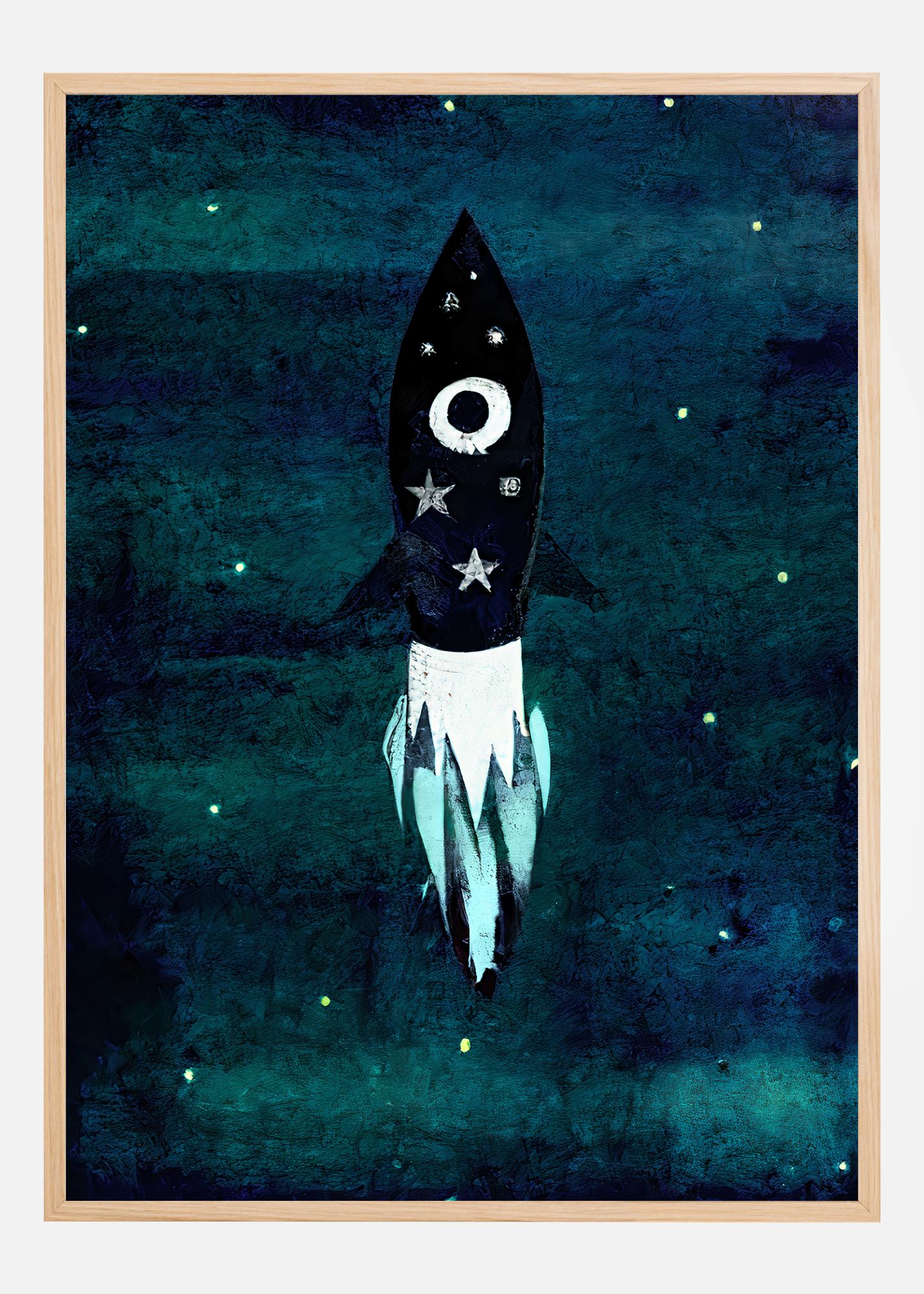 Pabrėžkite žvaigždėtąją fantaziją su šiuo plakatu, kuris vaizduoja raketą atradimų kelionėje per spalvingą kosmosą. Giliai sočios mėlynos spalvos fonas yra nusėtas šviesos taškeliais, panašiais į žvaigždes, ir suteikia begalinės erdvės iliuziją. Pati raketa, dekoruota sidabrinėmis žvaigždėmis ir mėnuliu, tampa žmonijos svajonės apie kosminių kelionių ir nežinomo tyrinėjimo simboliu.