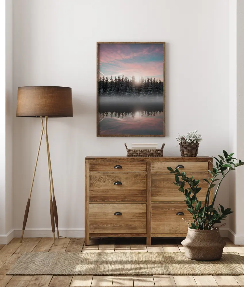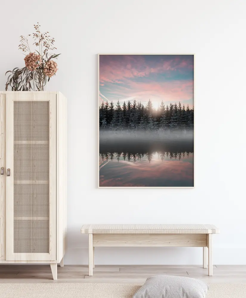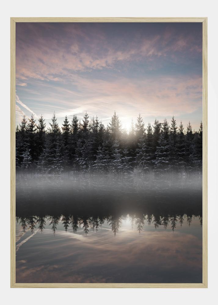 Magiškas plakatas su rūkais apgaubtu ežeru ankstyvo ryto šviesoje. Sniegu padengti medžiai stovi krante, dalinai apgaubti rūko. Medžių atspindžiai švelniose pastelinėse ežero spalvose. Virš medžių viršūnių kyla saulė, metanti švelnią šviesą ant rožinio ir mėlyno dangaus, sukurdama ramią atmosferą.