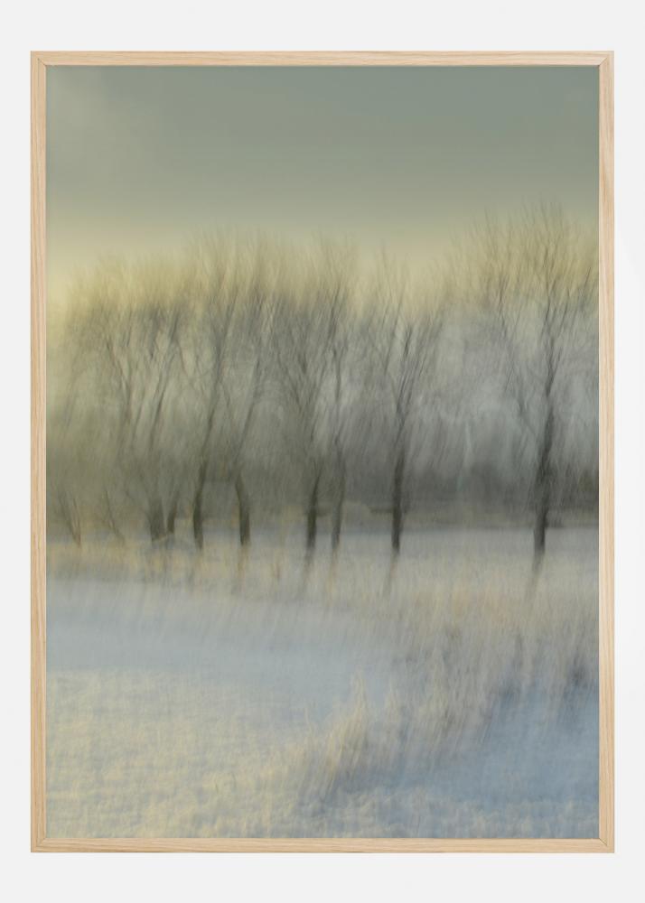 Nuostabus plakatas judesio susiliejimo stiliumi su medžiais žiemos fone. Baltas sniegas dengia viską šioje minkštoje, nefokusuotoje nuotraukoje. Medžiai yra išsilieję, matomi tik aukšti juodi kamienai, o švelni geltona juosta plaukia virš medžių viršūnių. Magija tikrai jaučiama ore.