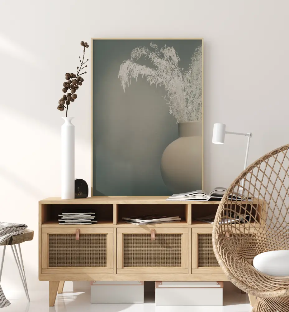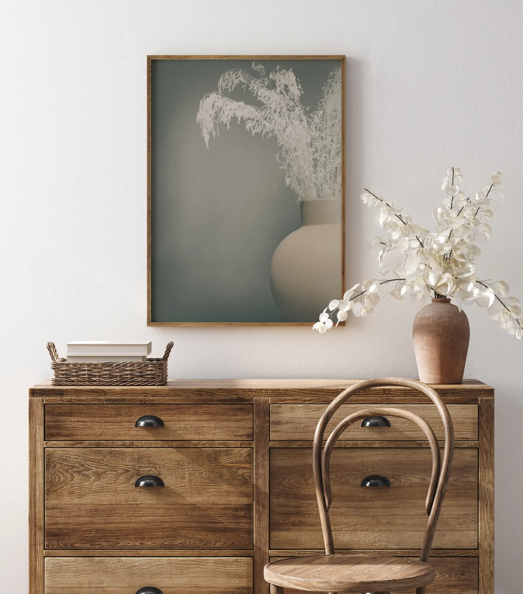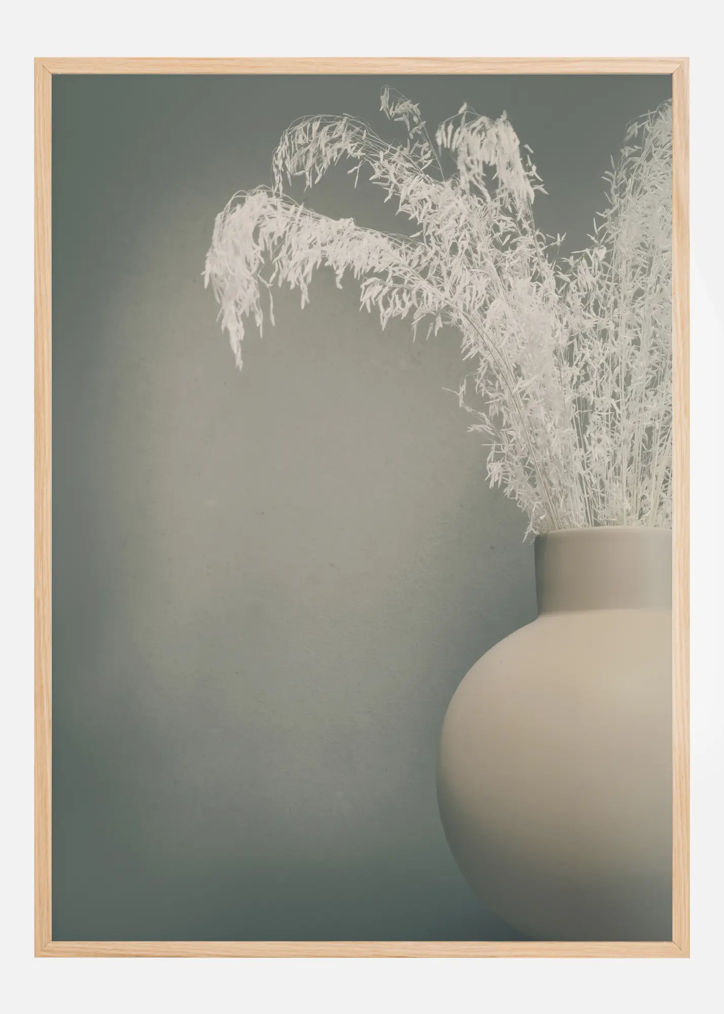 Plakatas su gyvybės piešiniu balto vazono su kai kuriomis minkštomis kutėmis, nupieštais prieš šviesiai mėlynai pilką sieną. Vazonas stovi dešinėje paveikslo pusėje, o balti kutai švelniai siūbuoja žemyn, sukuriantys tikrai minkštą pojūtį. Švelnūs pasteliniai atspalviai yra raminantys ir taikūs.