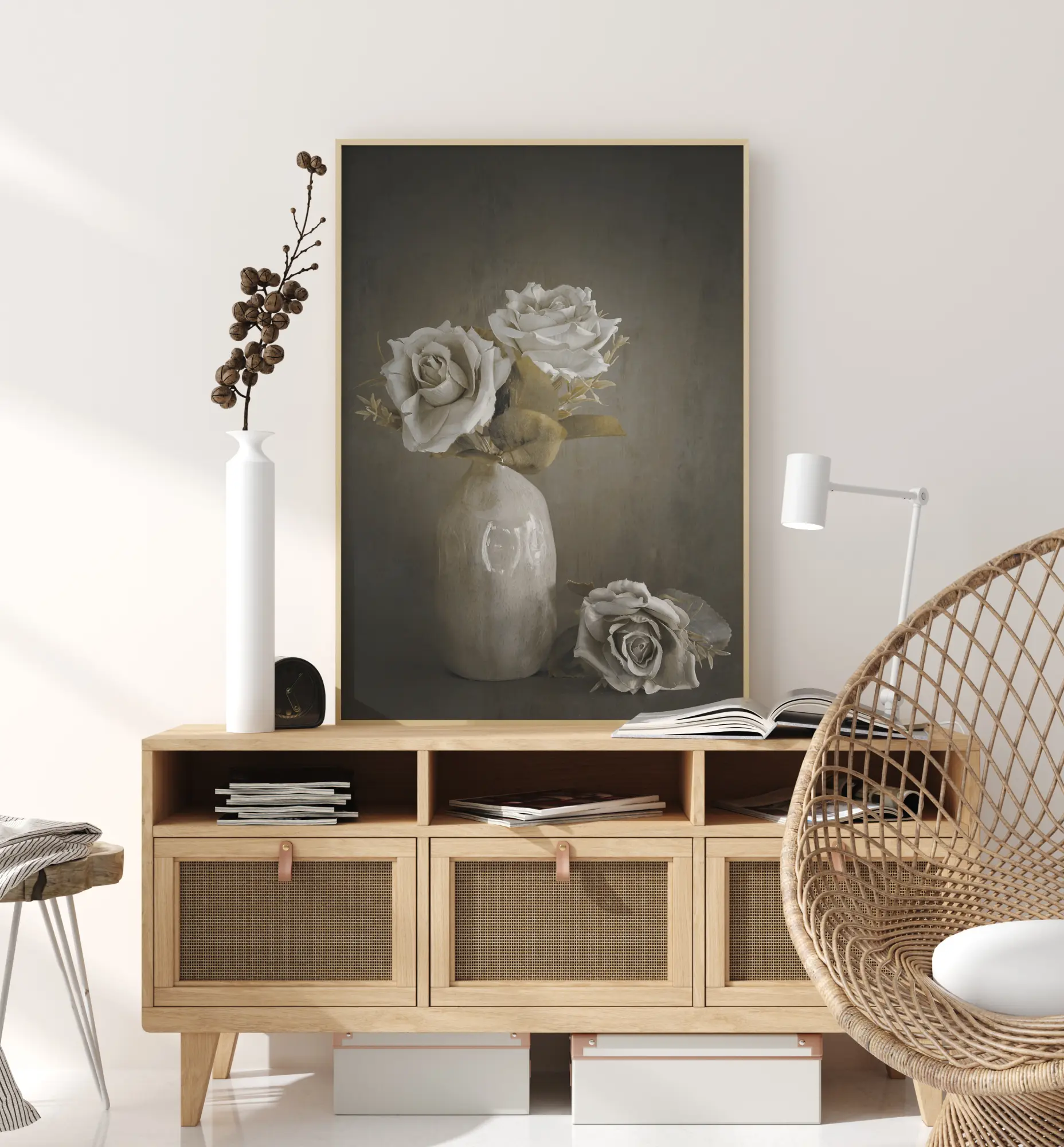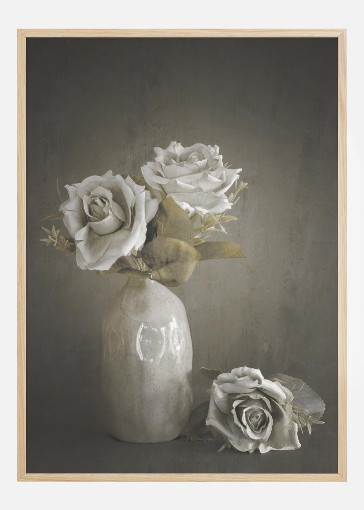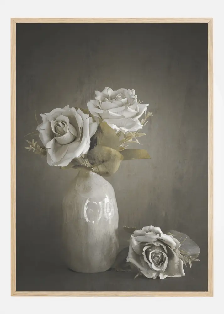 Paprastas plakatas su nupieštomis rožėmis vazoje. Dvi baltos rožės stovi baltame vazone, trečioji rožė padėta ant lentynos šalia. Kiekviena rožė šviečia nematomos šviesos fone švelniai tamsiai pilko fono, sukurdama elegantišką, bet vis tiek teatrinį vaizdą.