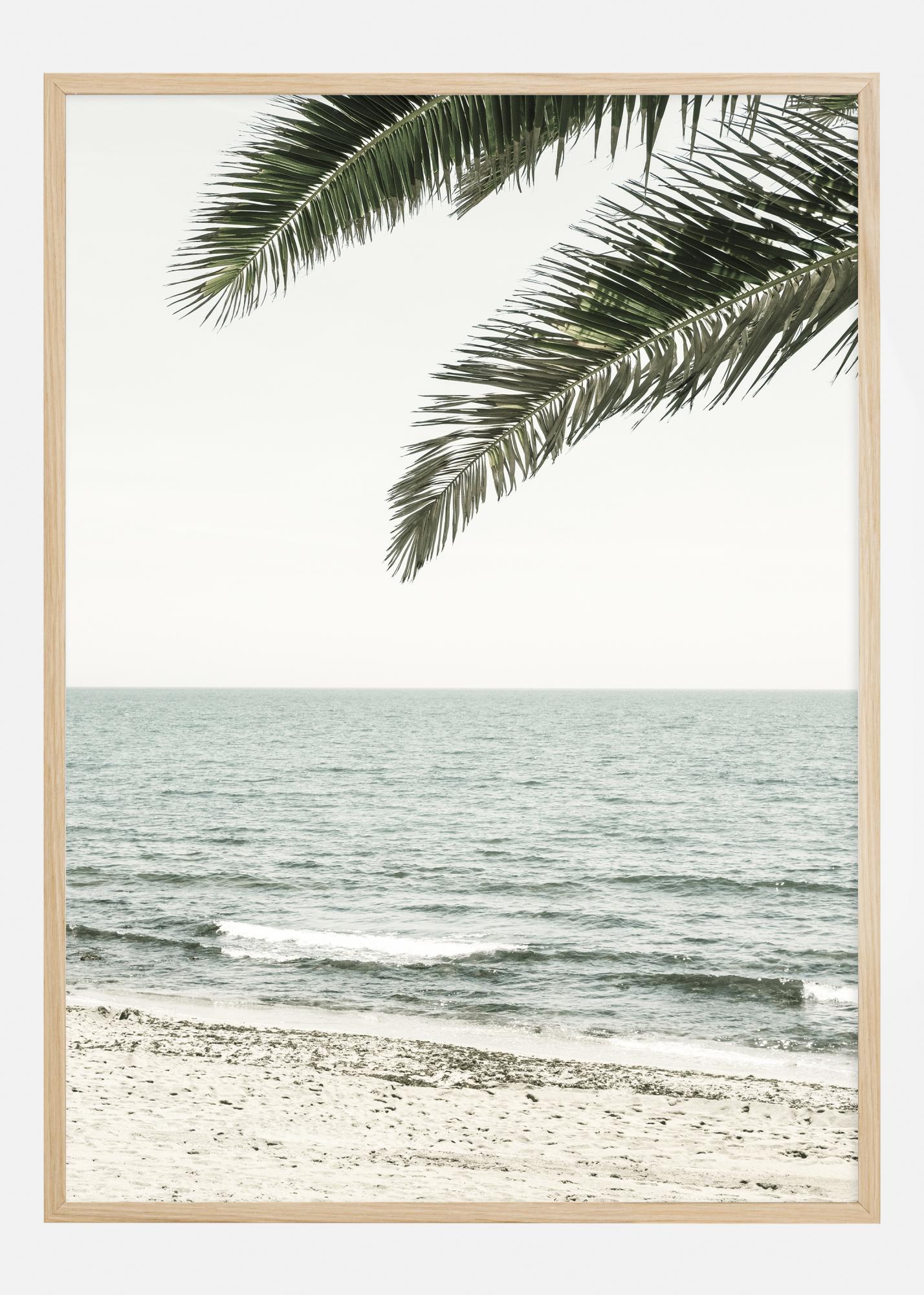 Pajuskite tropinio prieglobsčio ramybę su šiuo plakatu, kuris vaizduoja besisupančių palmių lapų vaizdą prieš ryškiai mėlyną dangų ir ramų jūrą. Raminanti paplūdimio scena yra įrėminta ryškiai žaliais lapais, kurie sukuria natūralų lango efektą ir kviečia žiūrovą pasvajoti apie šiltesnius kraštus.