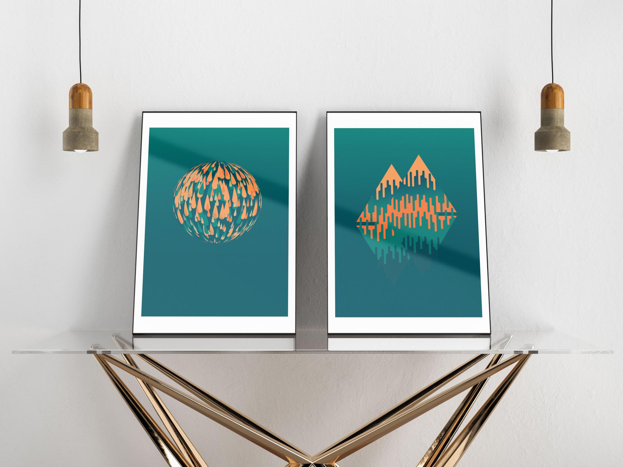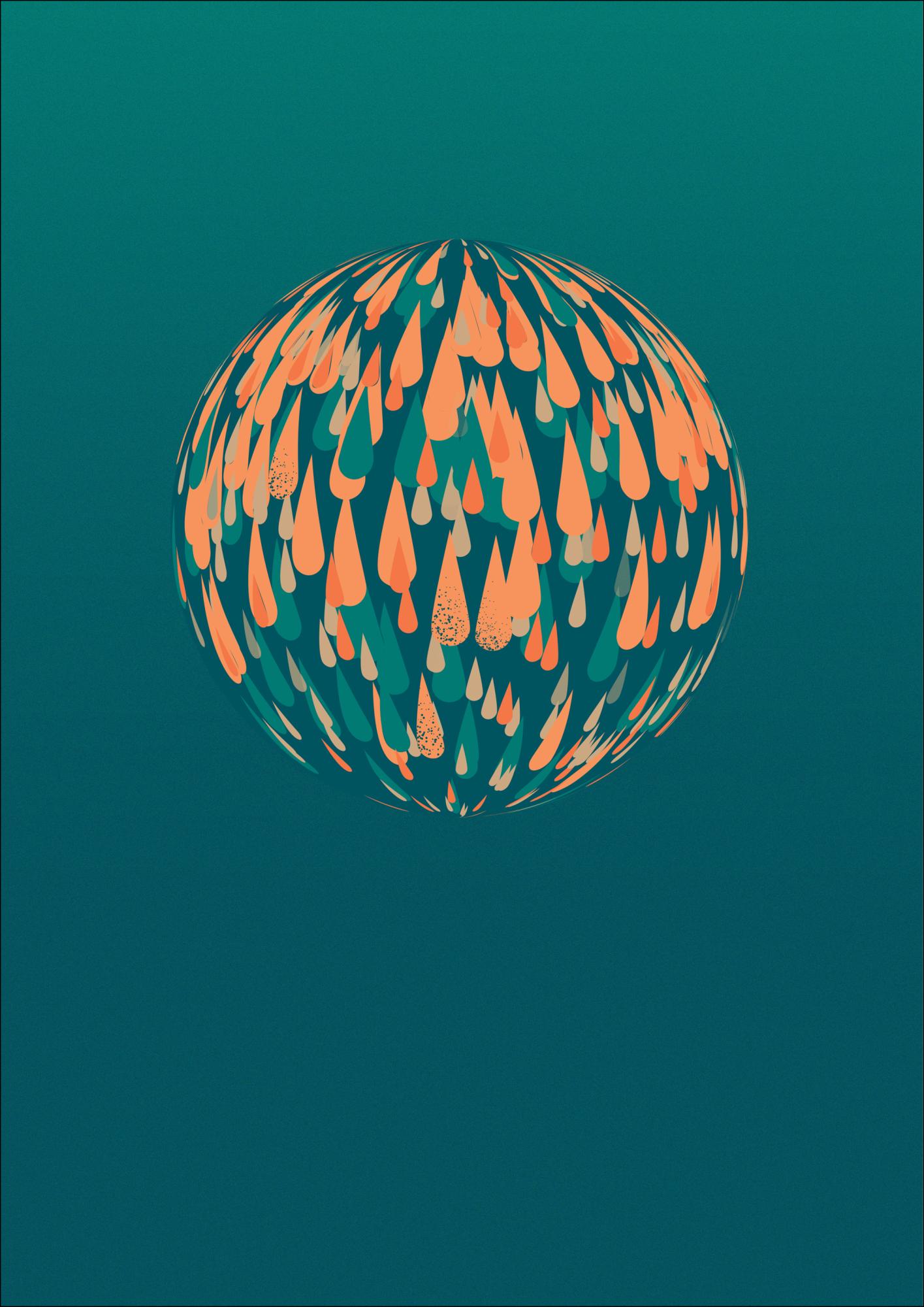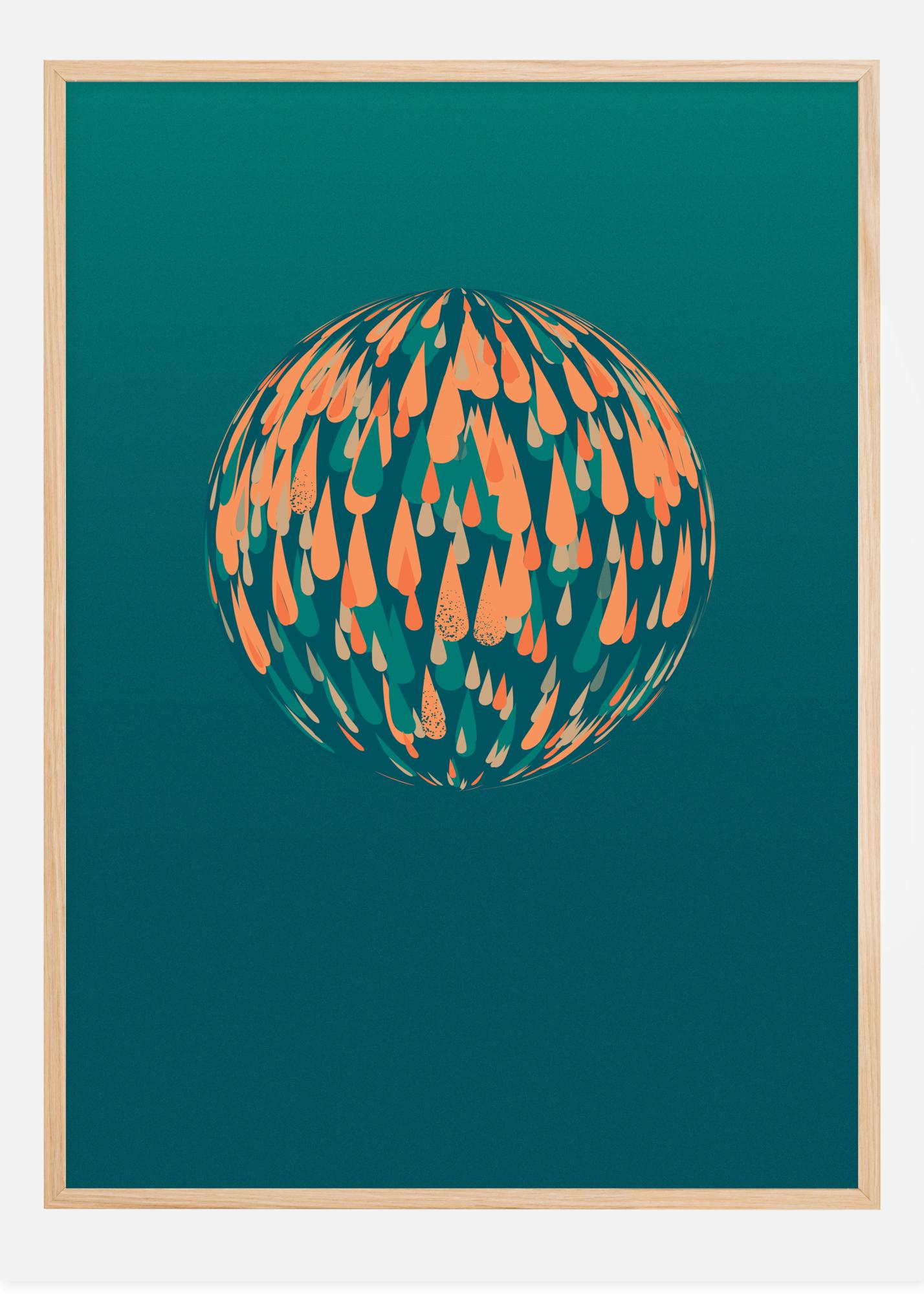 Šviesus plakatas su sfera, sudaryta iš šviesių spalvų lašų. Oranžiniai ir mėlyni lašai sukuria 3D sferą ant nuostabaus žalio fono. Šis paprastas, bet vis dėlto elegantiškas vaizdas yra žavus, kai matote, kaip visi lašai sulūžta po sfera. Pakabinkite šį vaizdą ant paprastos lygios sienos, kad neišryškintumėte spalvų.
