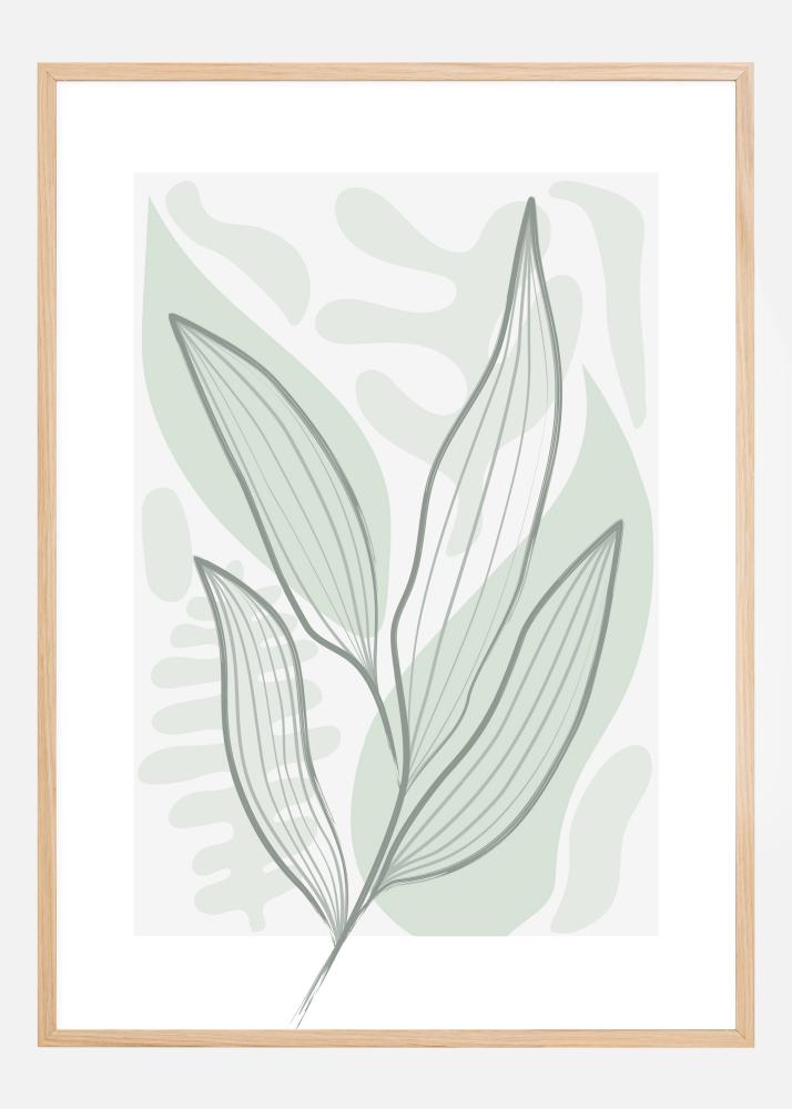 Abstraktus plakatas su lapais ant paprasto žalios spalvos fono su skirtingomis lapų formomis ir raštais. Švelnios žalios ir pilkos spalvos suteikia paprastai lapų dizainui, kuris yra ribojamas stipria pilka linija, stiprų, bet švelnų pavasario pojūtį, kurį galima kabinti bet kuriame namų kambaryje.