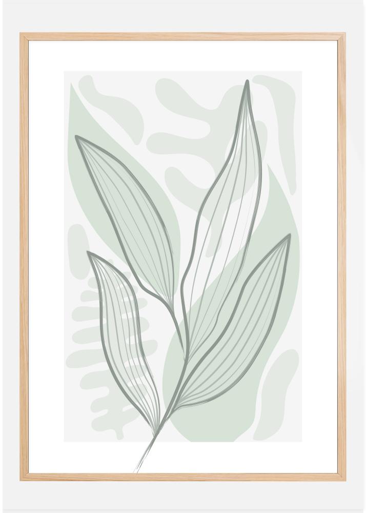 Abstraktus plakatas su lapais ant paprastos žalios fonos su įvairiomis lapų formomis ir raštais. Naudojant švelnias žalias ir pilkas spalvas, paprastas lapų dizainas, atskirtas stipria pilka linija, sukuria stiprią, bet švelnią pavasario nuotaiką, kuri gali būti pakabinta bet kuriame namų kambaryje.