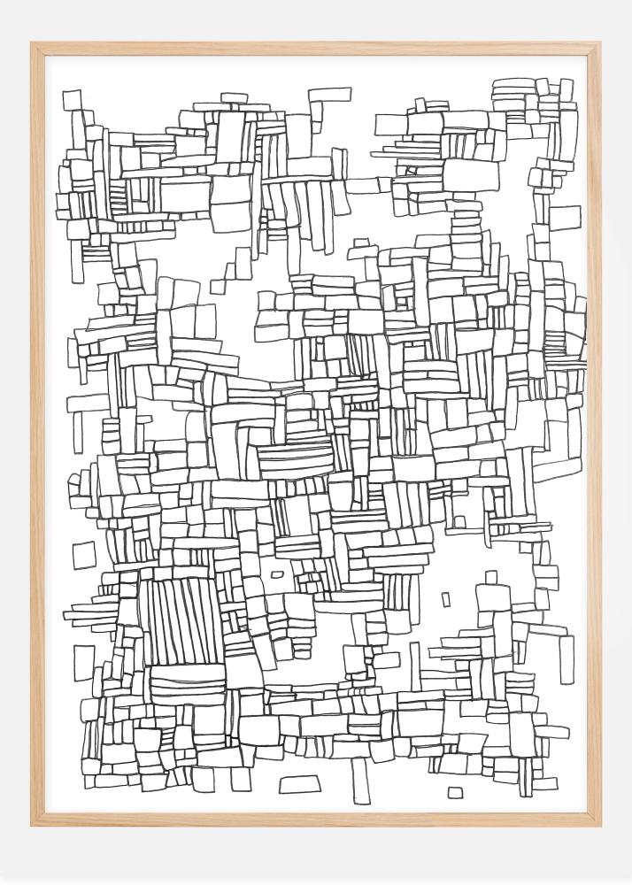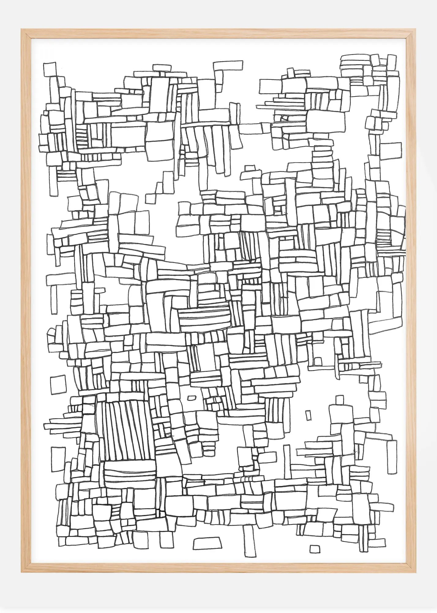 Plakatas su geometrinėmis kvadratais juodomis linijomis ant balto fono. Šimtai mažų kvadratų ir stačiakampių susijungia, kad sukurtų keistą raštą per visą paveikslėlį. Pažvelkite į jį ir bandykite rasti raštus ir formas, kai šis kalbantis kūrinys kabo jūsų namuose.