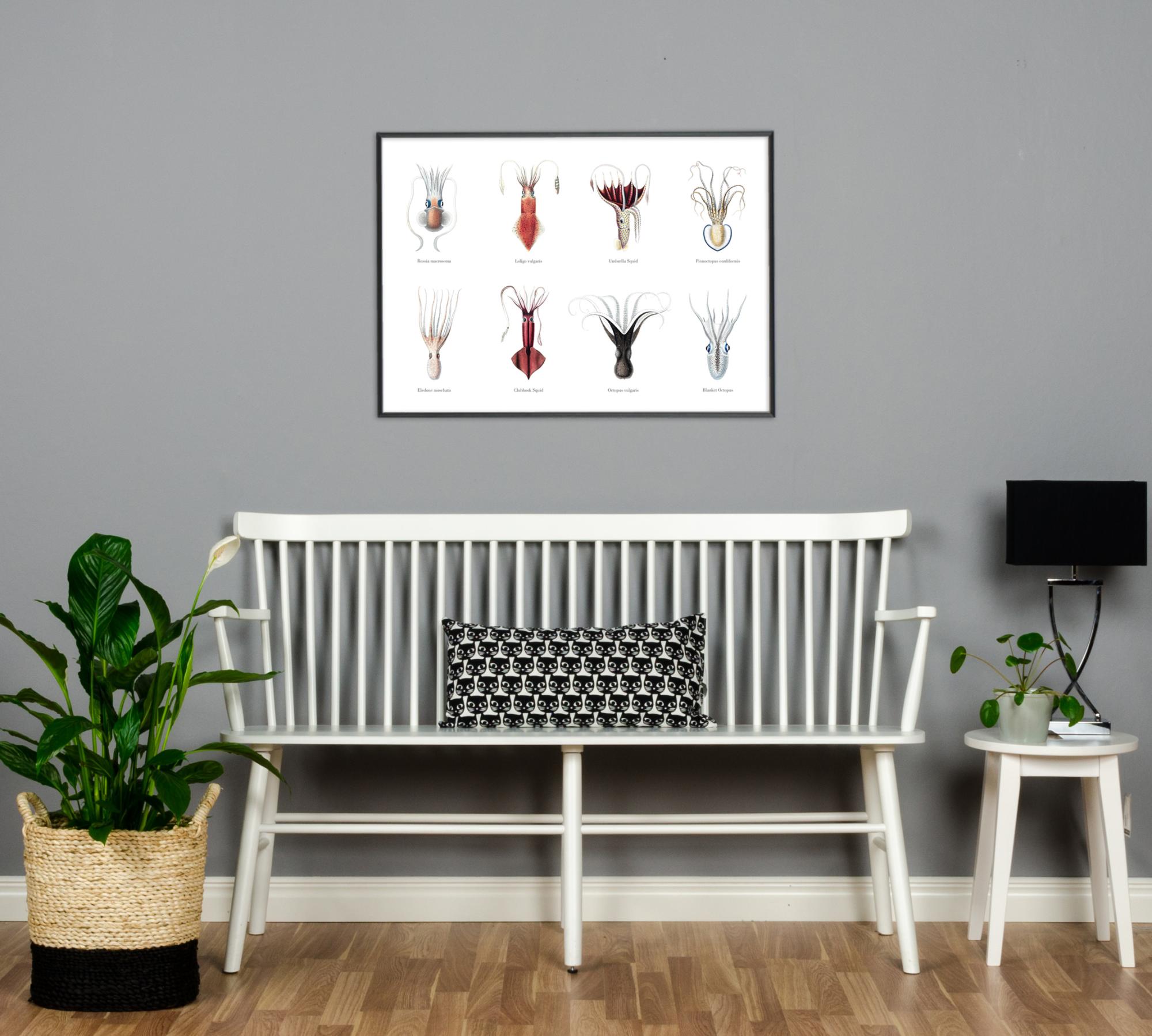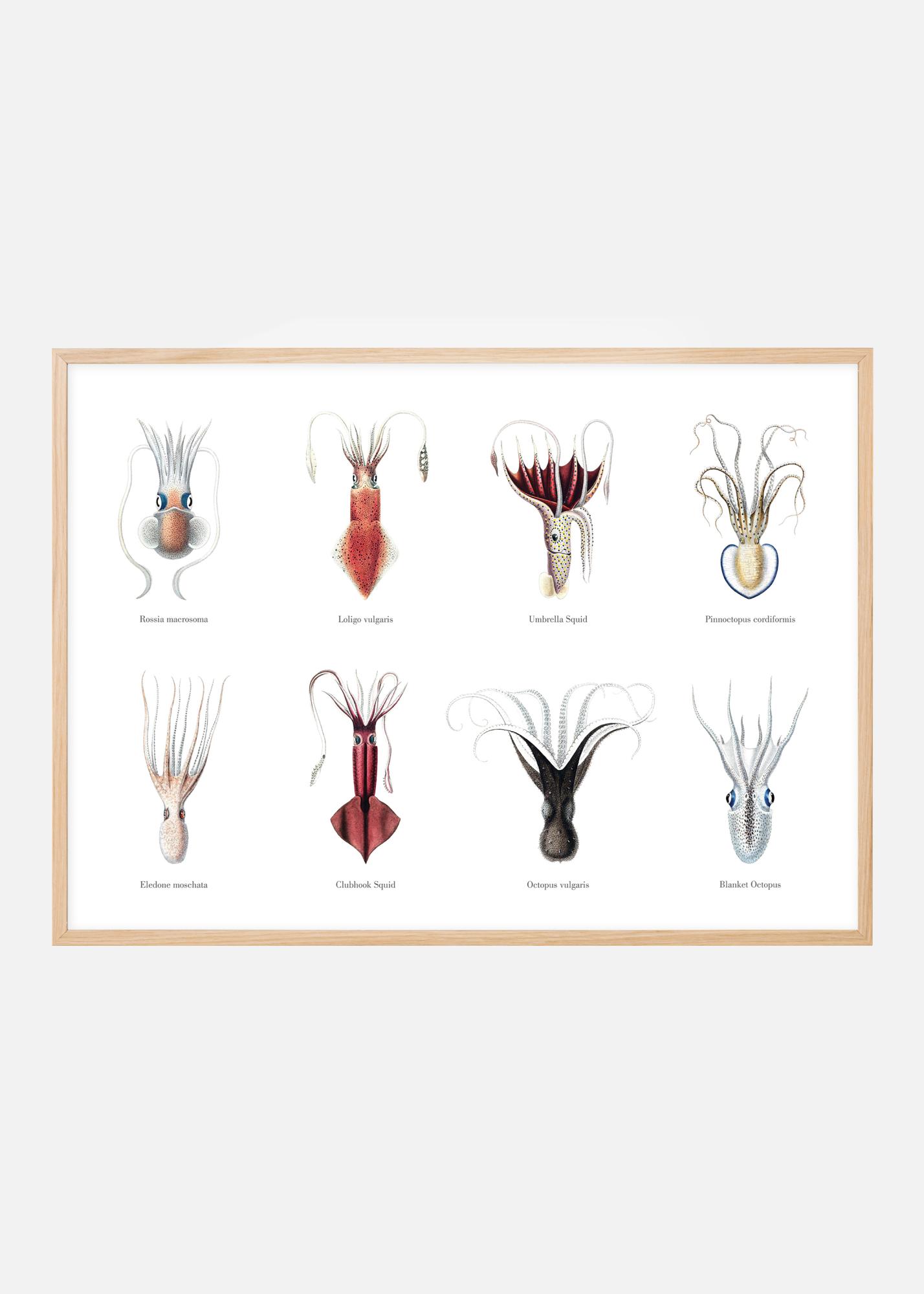 Aštuonkojis iš tiesų yra įdomus padaras. Ar žinojote, pavyzdžiui, kad jis turi 3 širdis? Arba kad jo intelektualios smegenys yra labai mažos, nepaisant to, kad milžiniškas daiktas, kuris atrodo kaip galva, atrodo, kad talpina milžiniškas smegenis? Be to, yra beveik 800 aštuonkojų rūšių! Ši graži vintažinė afiša vaizduoja 8 iš jų - nė viena nėra tokia pati kaip kita, tačiau visos vienodai žavios. Senosios iliustracijos turi žavių, gerai padarytų detalių, o po kiekviena rūšimi yra parašytas pavadinimas.