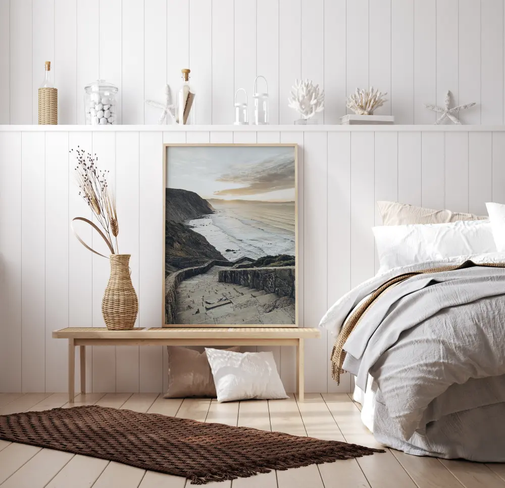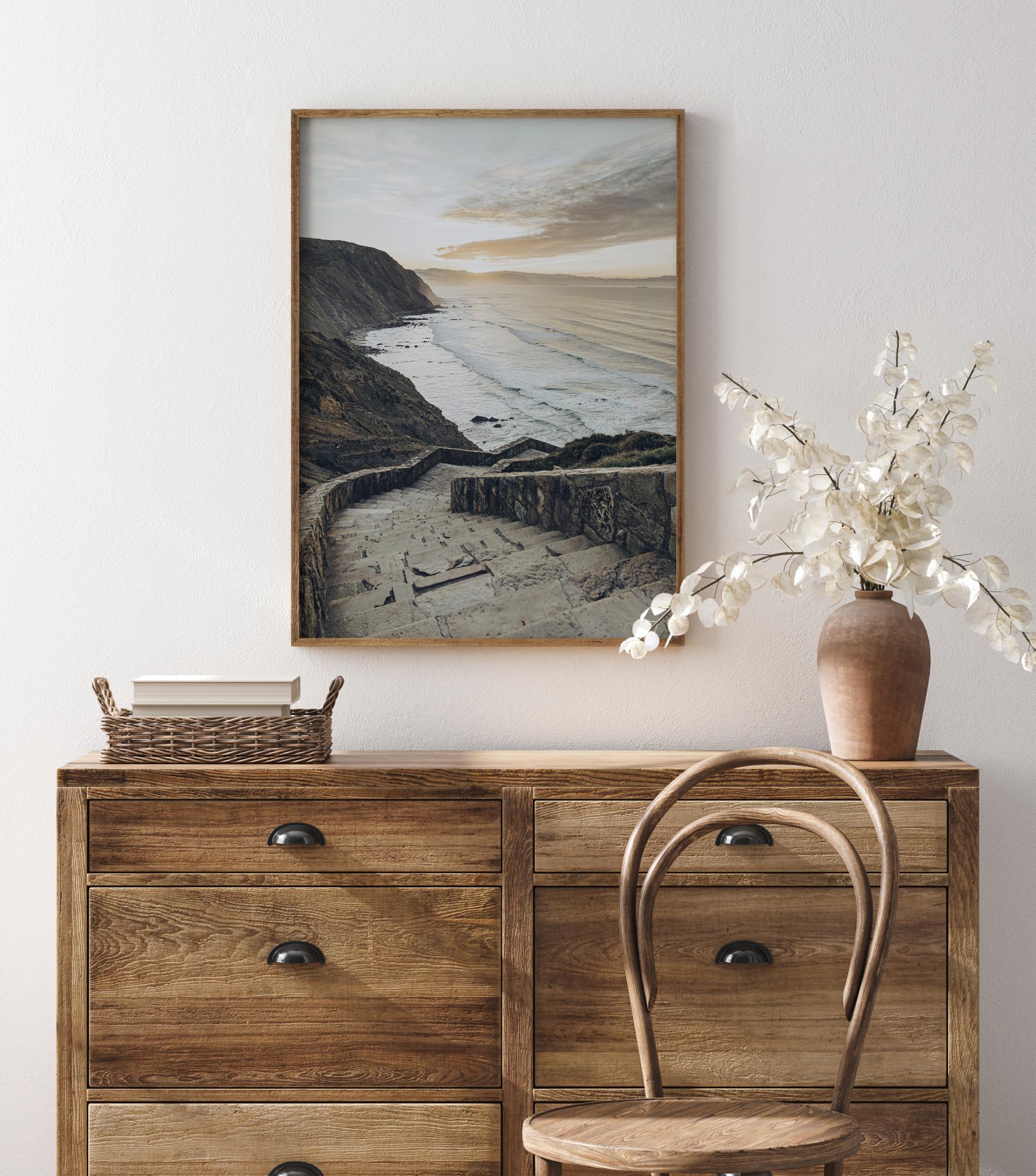 Nuostabus kraštovaizdžio plakatas su plataus kampo vaizdu į jūrą ir paplūdimį. Dideli akmeniniai laiptai veda žemyn nuo uolos link paplūdimio, kuris atspindi tolumoje esančio iškyšulio formą. Bangos daužosi į akmenuotą krantą šiame švelniame pasteliniame paveiksle.