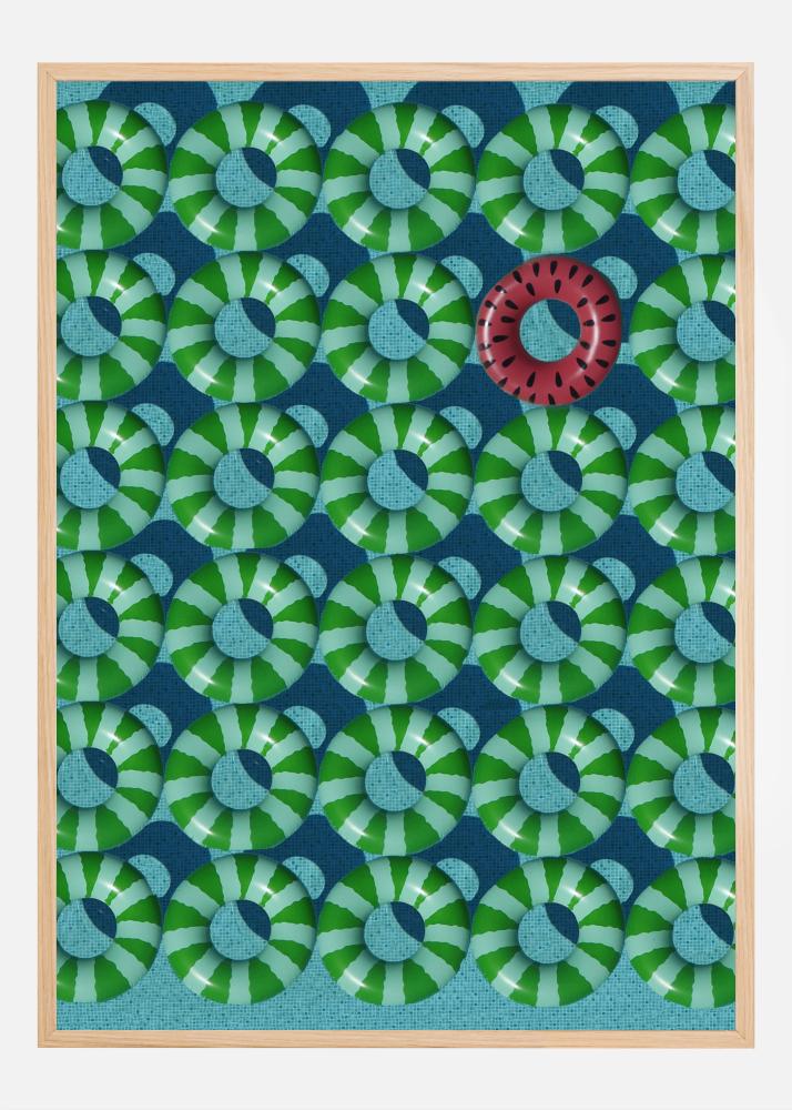 Šis žaismingas ir spalvingas plakatas yra duoklė individualumui ir originalumui. Tarp vienodų žalių ir baltų plaukimo ratų jūra akį traukia vienišas arbūzinis plaukimo ratas, suteikiantis greitą džiaugsmo ir smagumo pojūtį. Šis spaudinys – tobula vasaros kompanionė, pabrėžianti išskirtinumo reikšmę išsiskiriant iš minios.