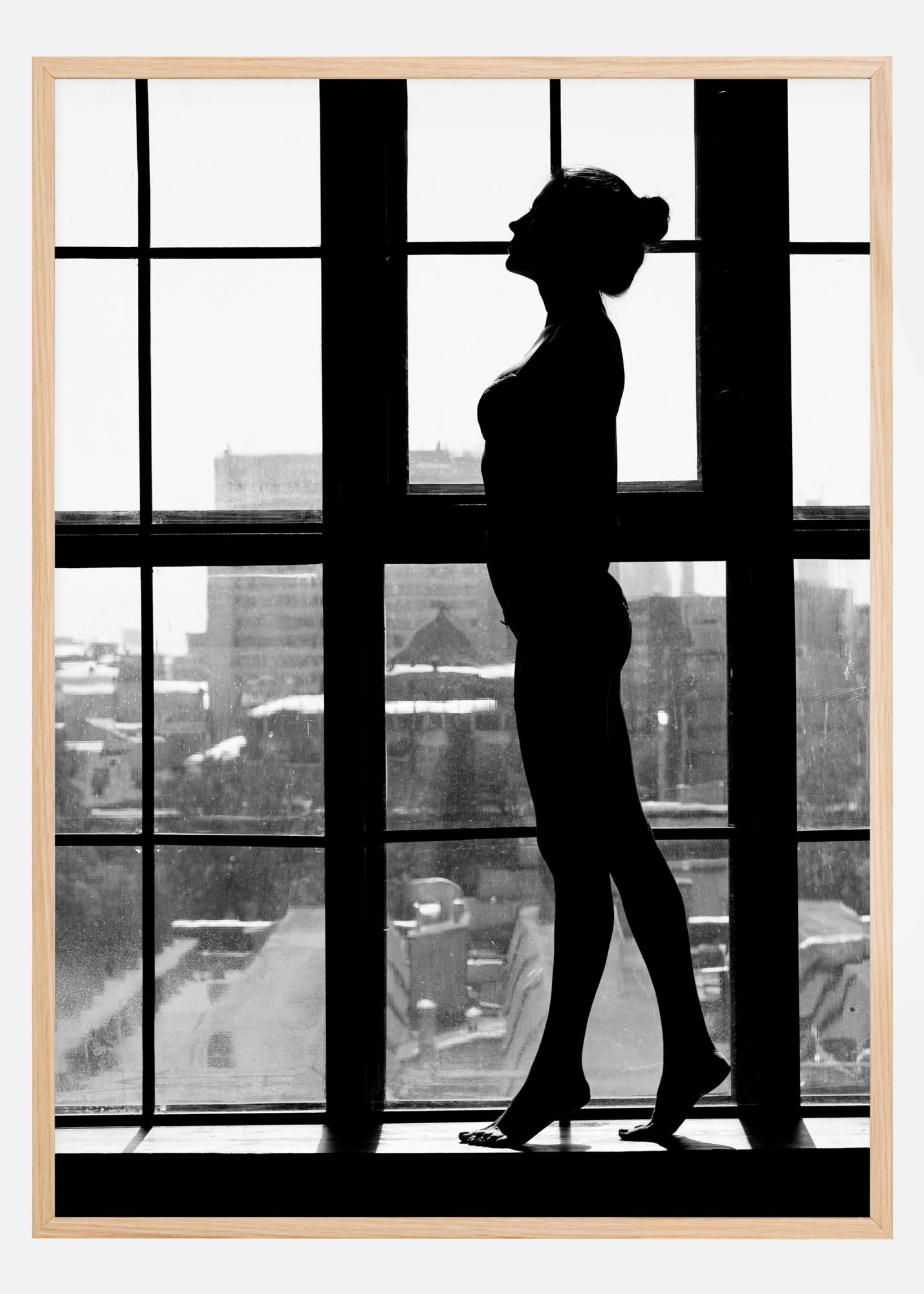 Fotografinis menas pilkoje skalėje moters, stovinčios dideliame industriniame lange. Priešpriešinė šviesa paverčia moterį tamsiu siluetu priešais miestą už jos. Stilingas plakatas, puikiai tinkantis derinti su kitais mėgstamais kūriniais ant didesnės paveikslų sienos.