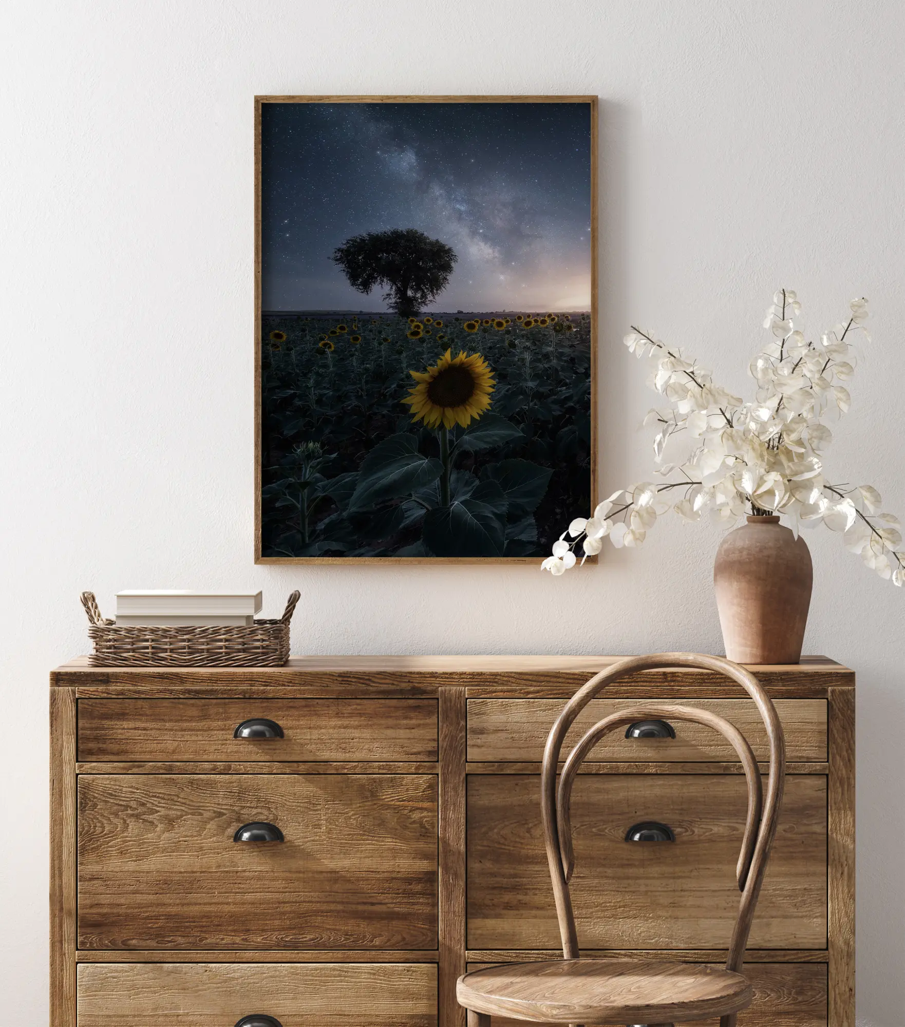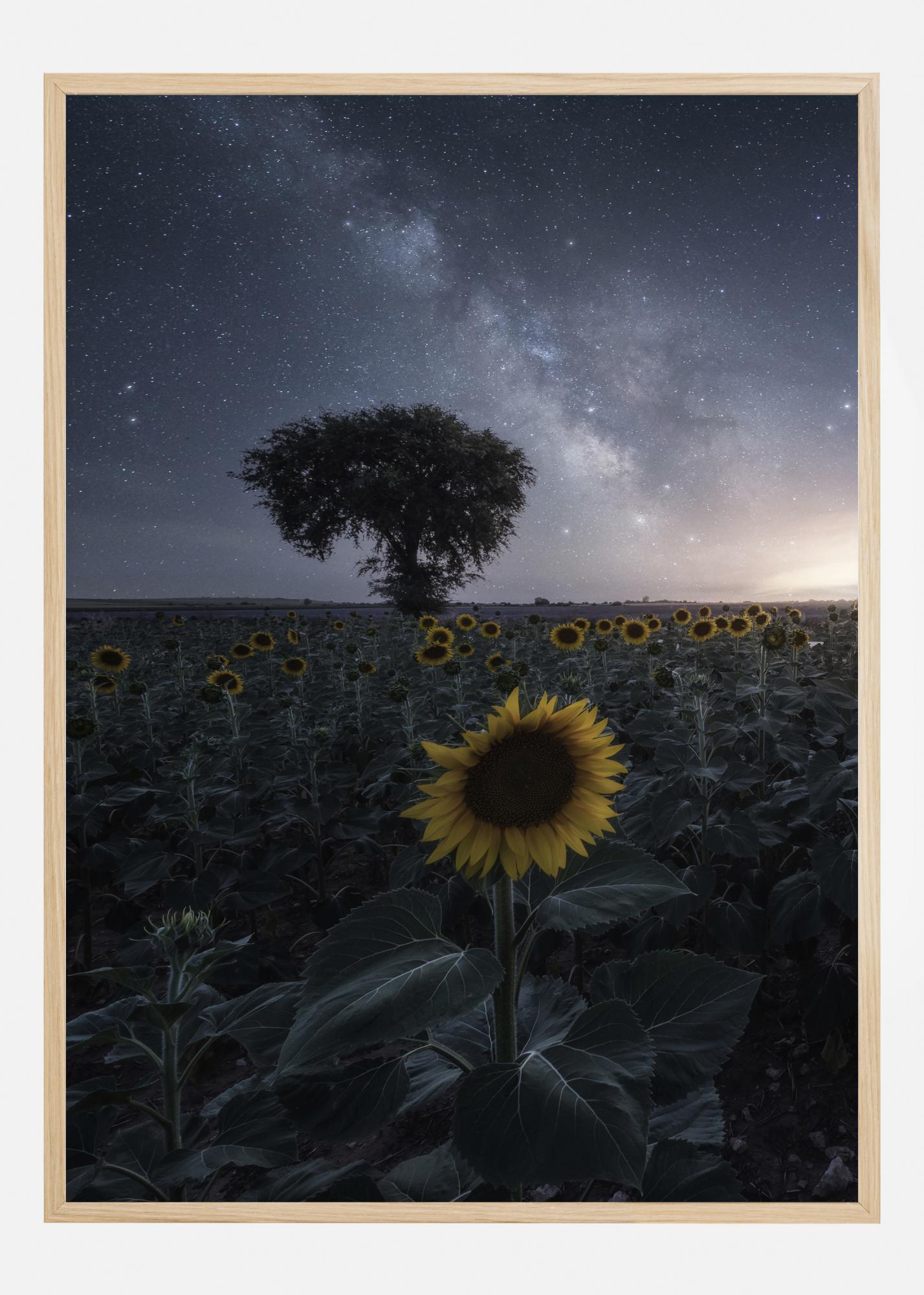 Gėlių plakatas su saulėgrąžomis naktį. Saulėgrąžų laukas laiko šviesiai geltonas gėles prieš naktinį dangų. Tai atsispindi tolimame saulėlydyje, kuris vis dar apšviečia gėles, bet taip pat apšviečia dangų, kad būtų matomos žvaigždės. Šioje vaizdo vietoje gausu paslapčių.