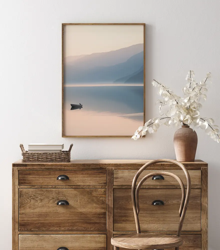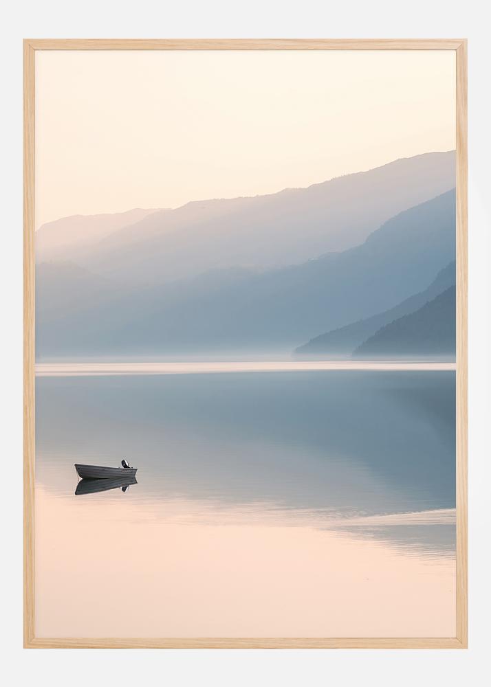 Ramus plakatas su valtimi didelio ežero viduryje. Šis vakarinis vaizdas yra nieko kito kaip tik ramybė. Ramus ežeras atspindi pastelinę mėlyną nuo kalnų, esančių už jo, sukuriant tylą ir poilsį, kuris persmelks ir jūsų namus.
