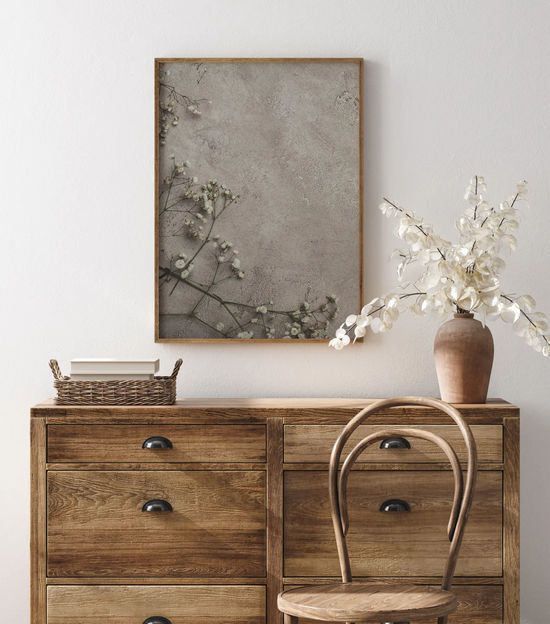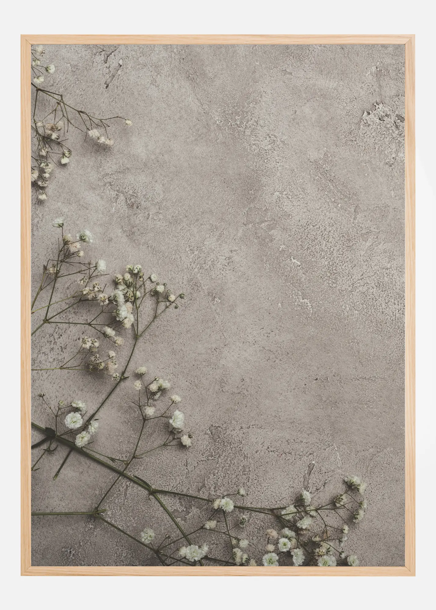 Natūralus plakatas su žydinčiais augalų stiebais, išskleistais ant akmeninių grindų. Švelnios baltos gėlės ir jų tamsesni šakoti stiebai dera su raštais tekstūruotose šviesiai pilkose grindyse. Čia galima pamatyti minkštų ir kietų elementų mišinį, kuris sukuria šį įdomų vaizdą.