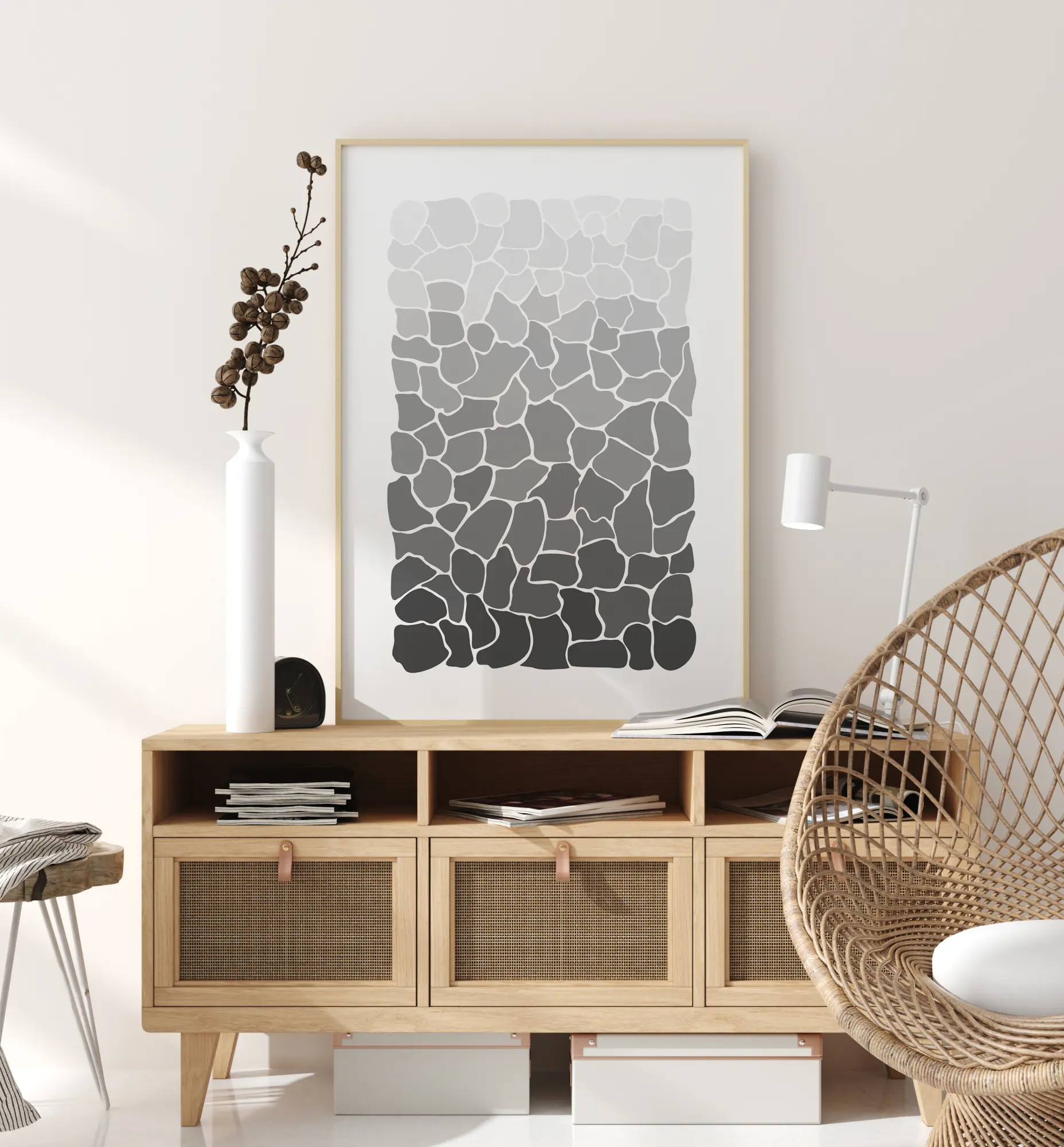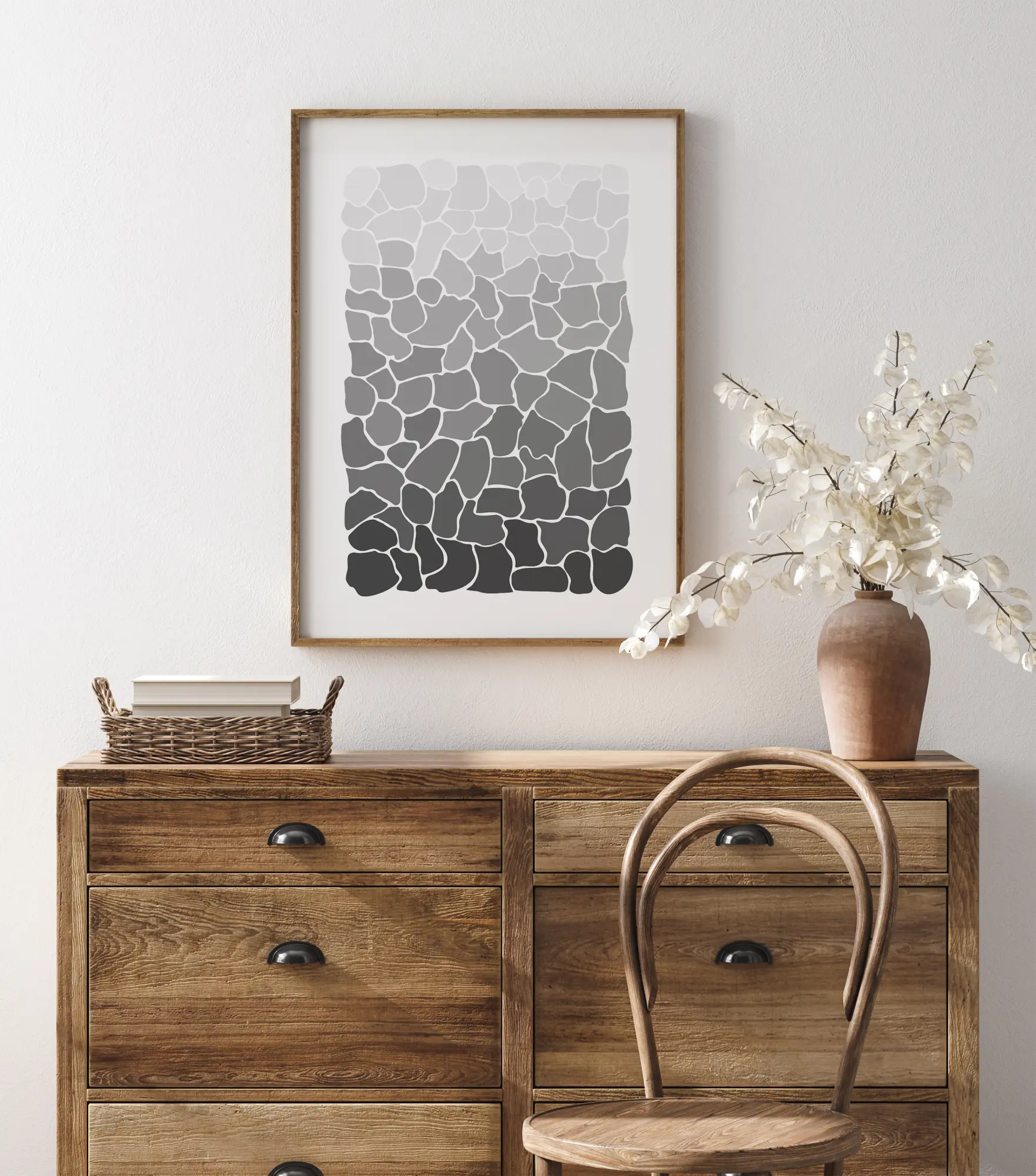 Formų plakatas su mažomis formomis, kurios susipina viena su kita, kad sukurtų įvairių pilkų atspalvių mozaiką. Tamsiai pilka prasideda apačioje, o spalvos išblunka į šviesesnį ir šviesesnį pilką, kai raštas kyla aukštyn puslapyje. Pakabinkite šį paveikslą ant šviesios sienos, kad spalvos nebūtų tokios matinės.