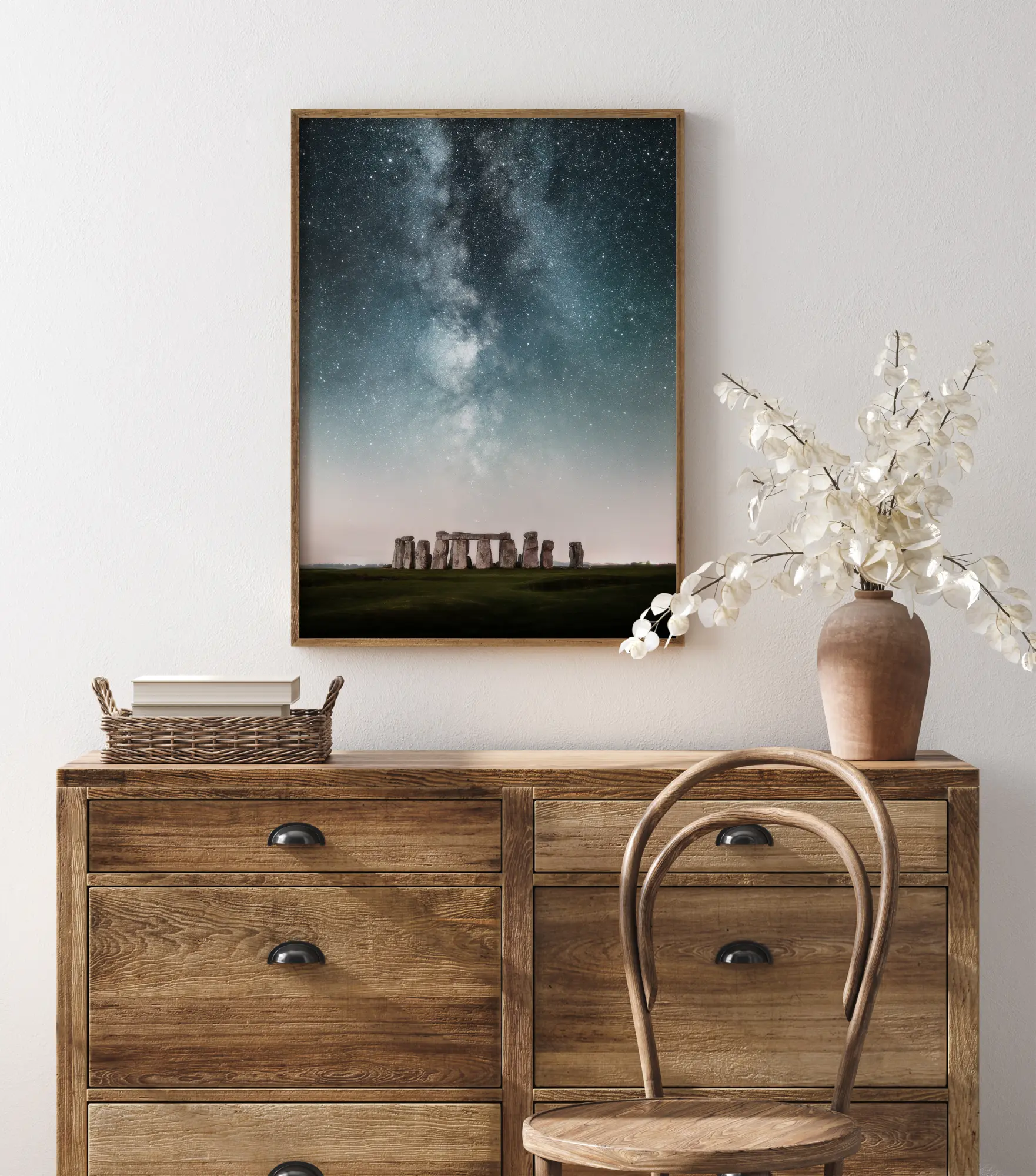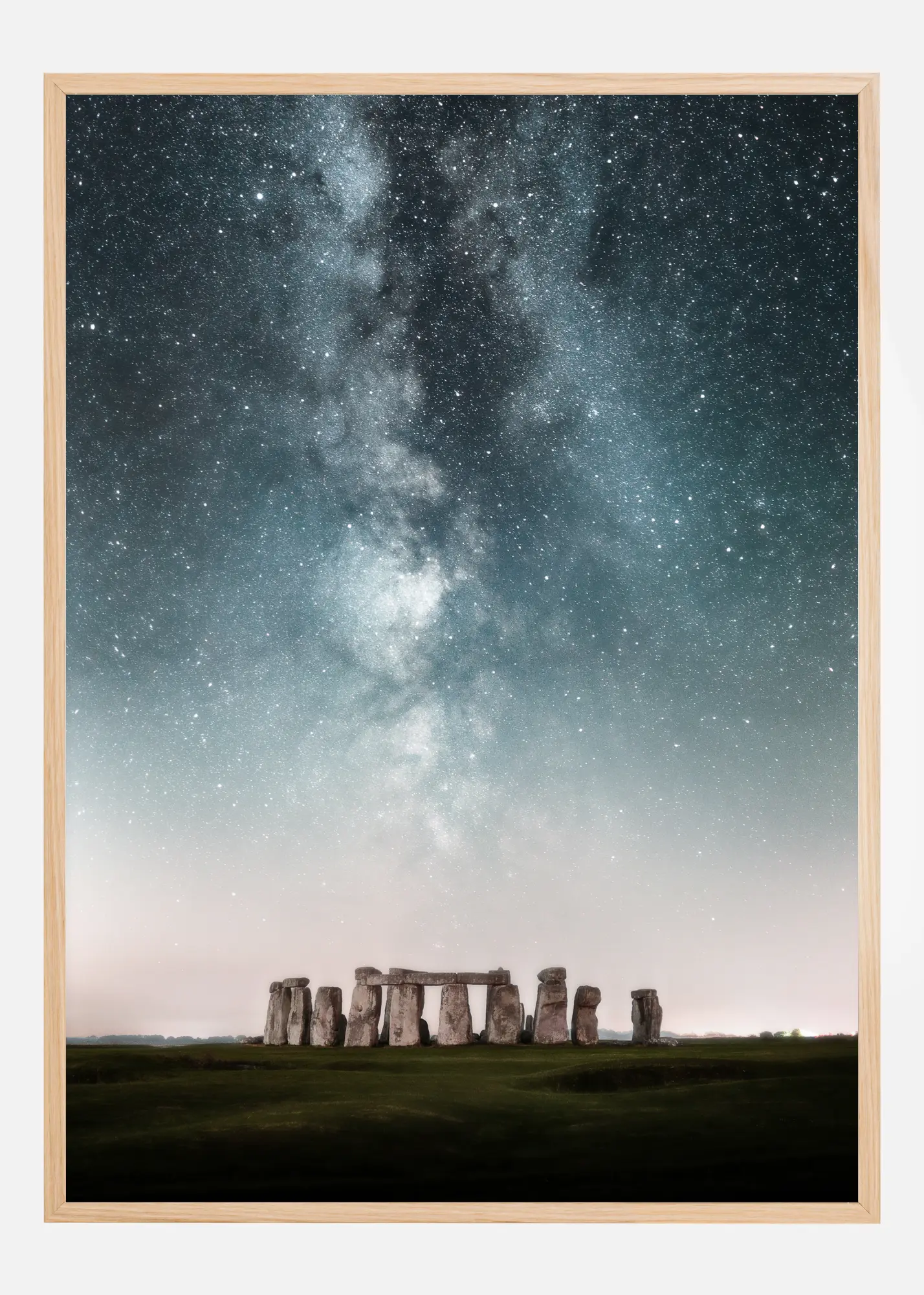 Garsus žymios vietovės plakatas su Stounhendžu prieš dramatišką žvaigždėtą naktinį dangų. Šis platus vaizdas susitelkia į dramatišką Paukščių Taką, kuris driekiasi per mėlyną žvaigždžių pripildytą dangų. Sekite galaktiką žemyn, kol pamatysite Stounhendžą kaip mažą akmens formaciją pačiame vaizdo apačioje, kad gautumėte kitokį požiūrį į šį įspūdingą pasaulio stebuklą.