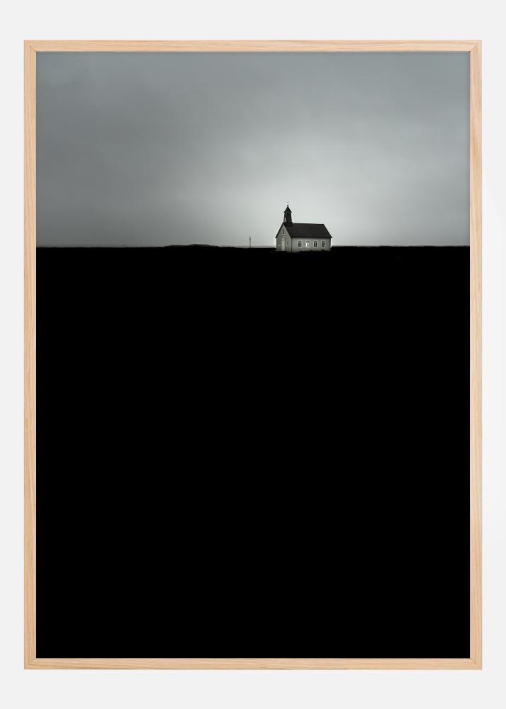 Šis plakatas suteikia stiprų ir nuotaikingą Strandarkirkja vaizdą, vienišą bažnyčią, stovinčią prieš dramatišką dangų. Tamsus kraštovaizdžio siluetas sukuria ryškų kontrastą su pilku dangumi, sukeldamas izoliacijos ir tylos jausmą. Bažnyčios balta siena apšviečia kraštovaizdį, simbolizuodama viltį ir vadovavimą aplinkiniame šešėlyje.